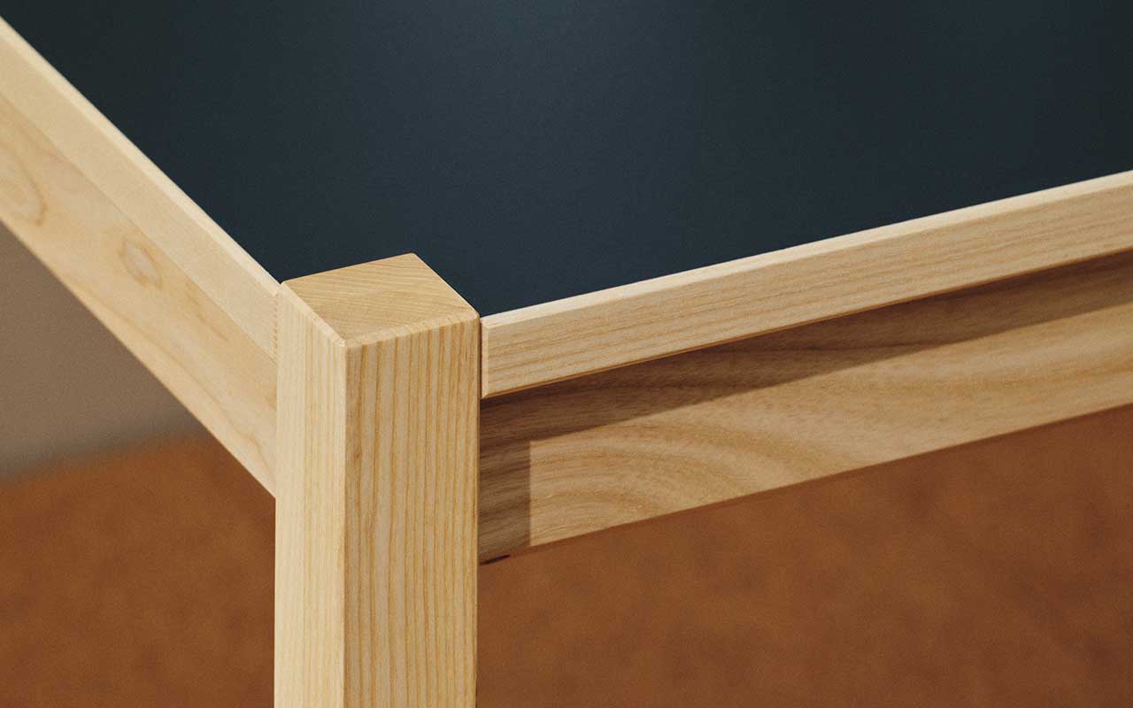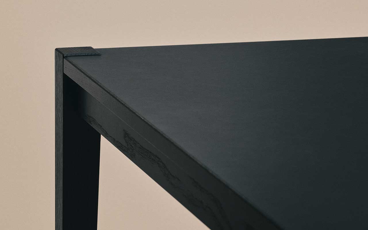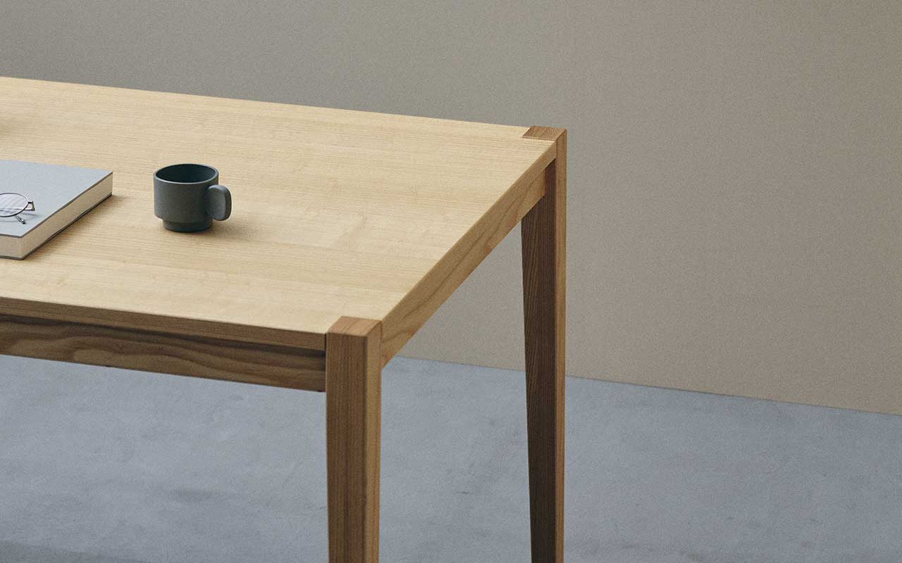 天板に脚が突き抜けるデザインが特徴で、脚と異なるカラーの天板を選ぶとコントラストが愉しめます。幕板を斜めにカットし、脚先にかけて細くなるテーパー加工を施すことで軽やかで洗練された印象に仕上げました。
