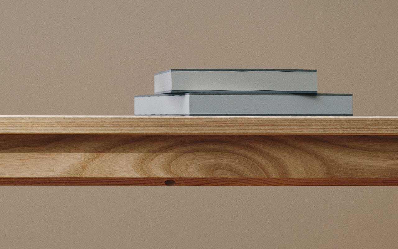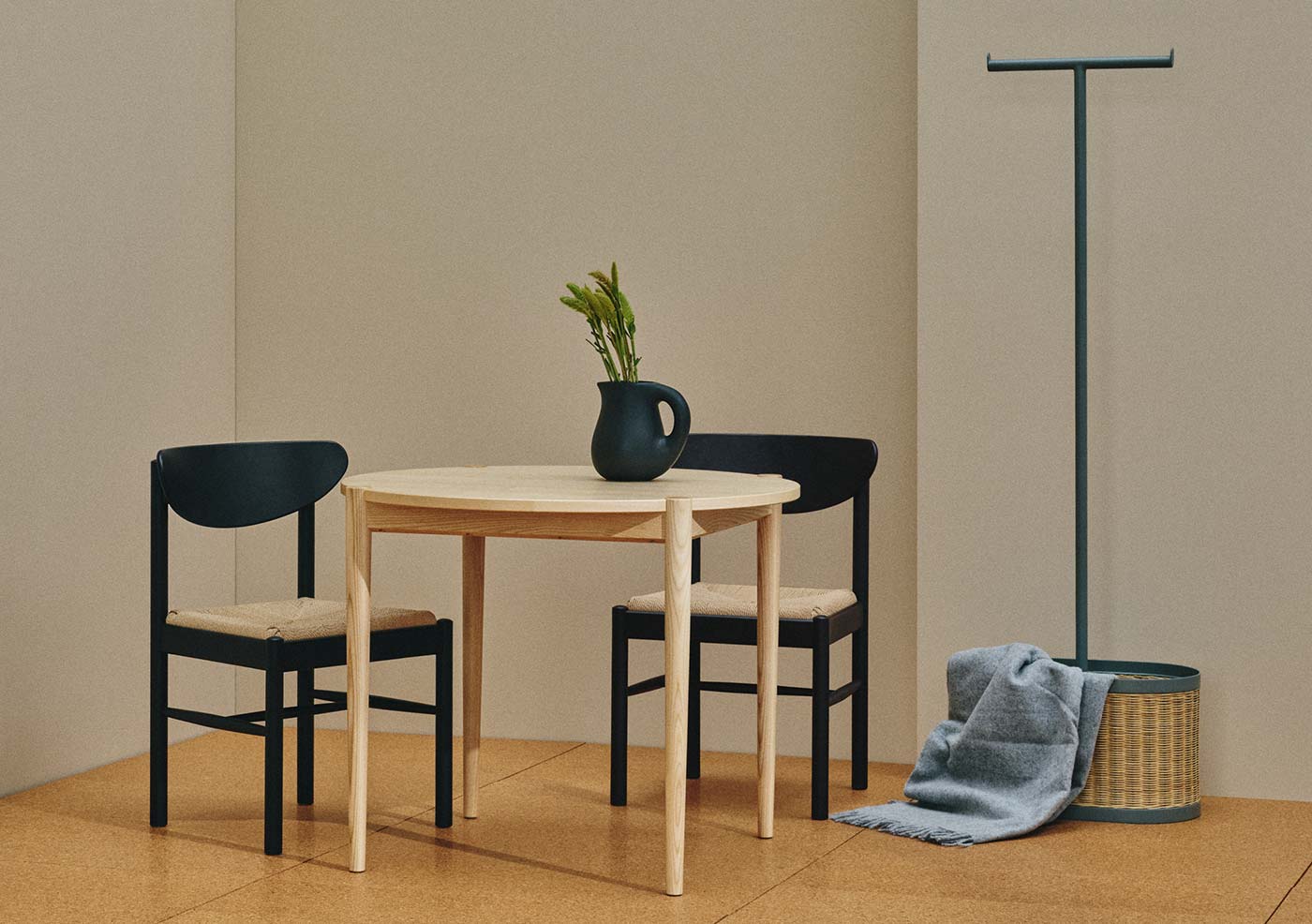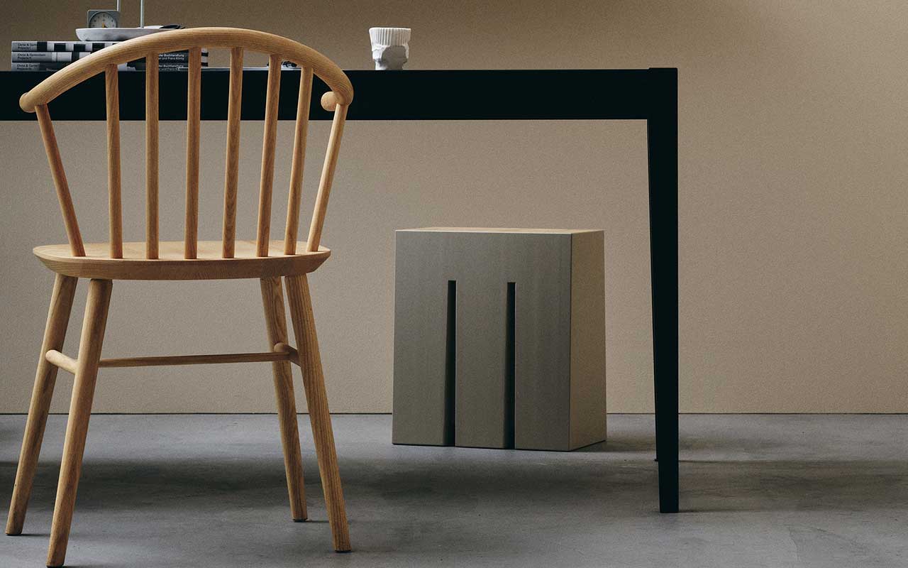 天板に脚が突き抜けるデザインが特徴で、脚と異なるカラーの天板を選ぶとコントラストが愉しめます。幕板を斜めにカットし、脚先にかけて細くなるテーパー加工を施すことで軽やかで洗練された印象に仕上げました。