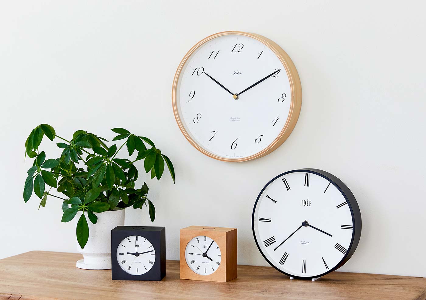 あらゆるインテリアに馴染みのよいミニマルなデザインのイデーオリジナル時計。空間を引き締めるブラックフレーム(φ20センチ)と、温もりを感じさせるウッドフレーム(φ25センチ)からお選びいただけます。 文字盤の数字をあしらったデザインの専用ボックスに入っており、ギフトにもおすすめです。