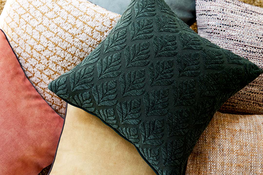 柄ものや挿し色を使ってインテリアにアクセントを。小ぶりながらも奥の深いクッションカバー。