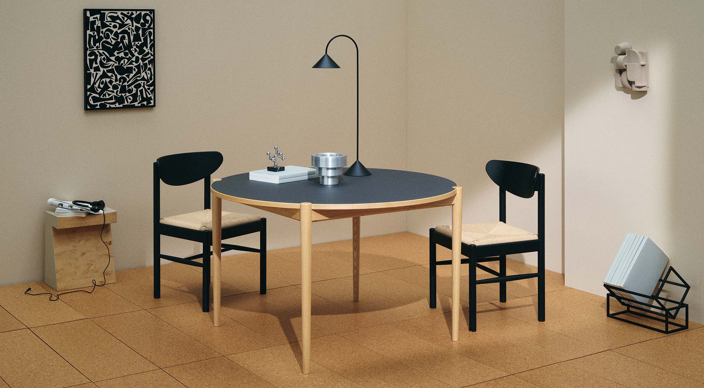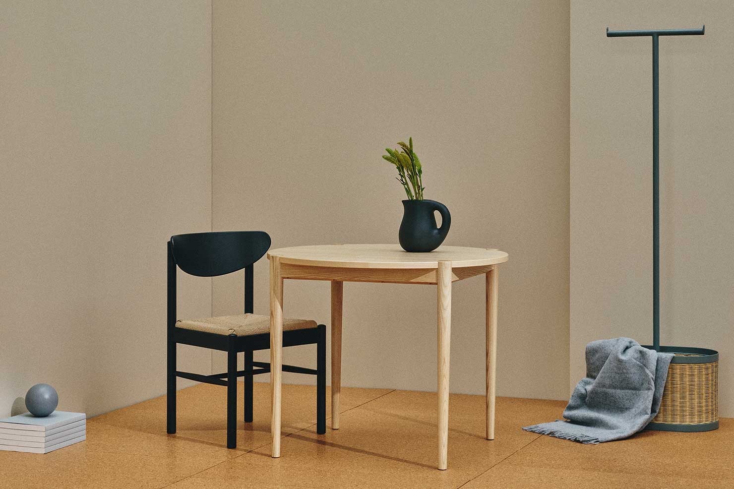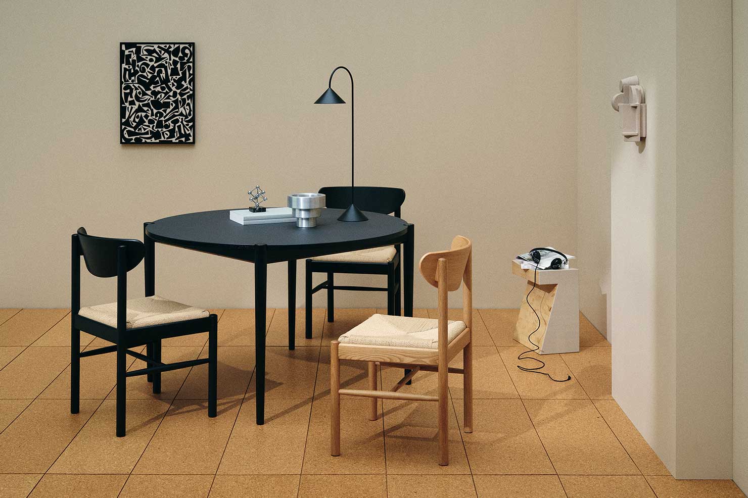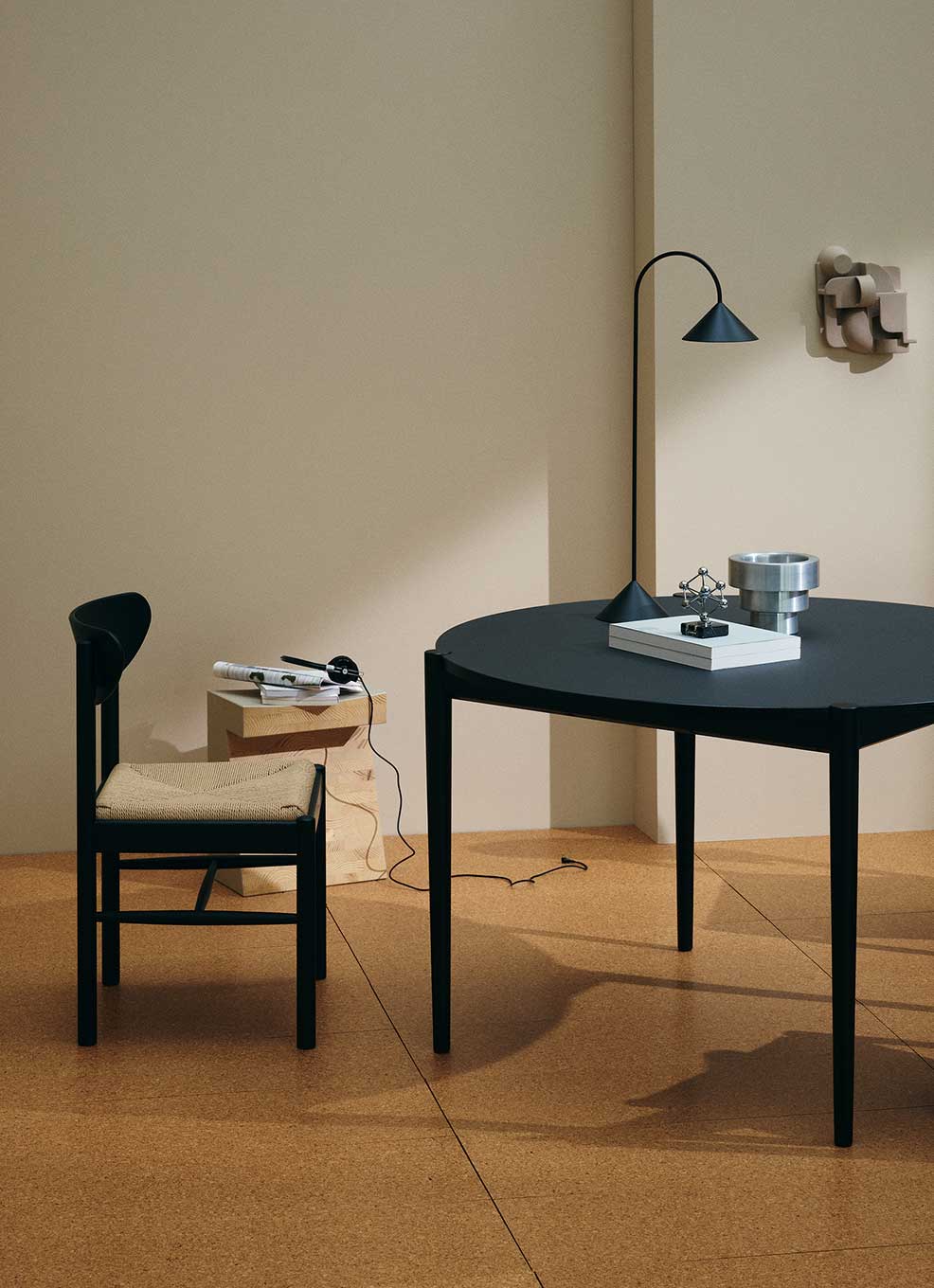 NOVA DINING TABLE ROUND 1200 Black × Charcoal, MEMOLA CHAIR Black, MEMOLA CHAIR Natural, FORM FIND STOOL Cut