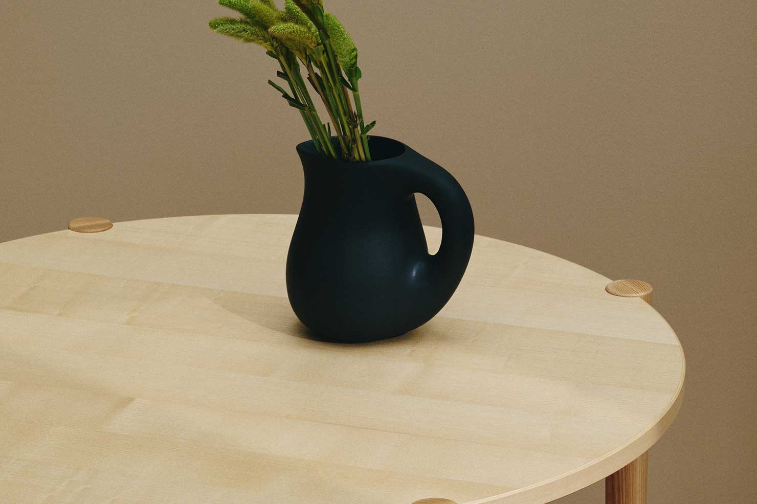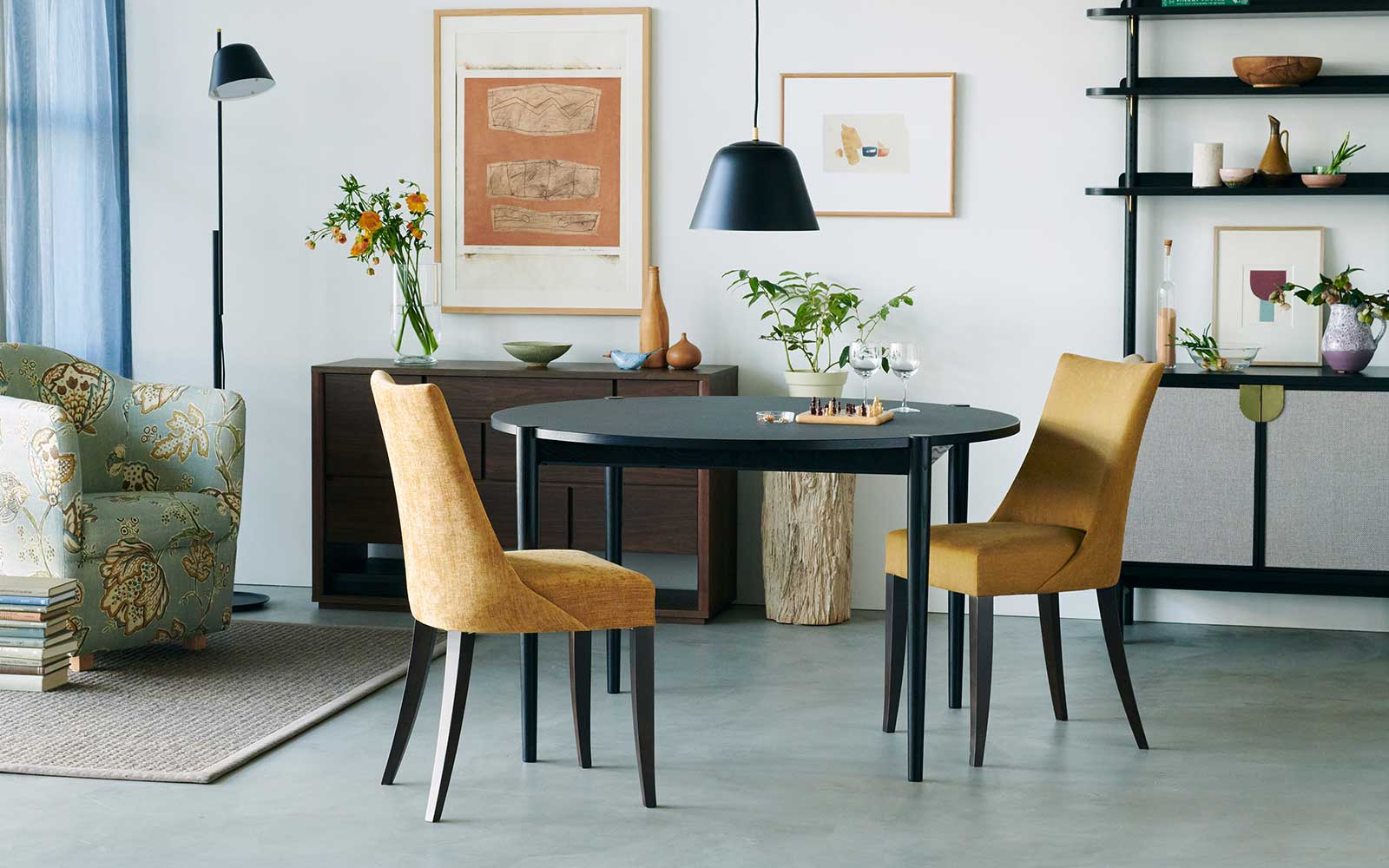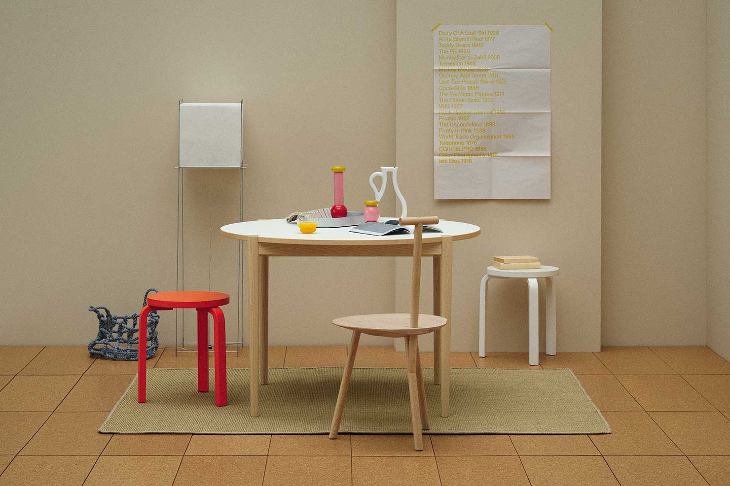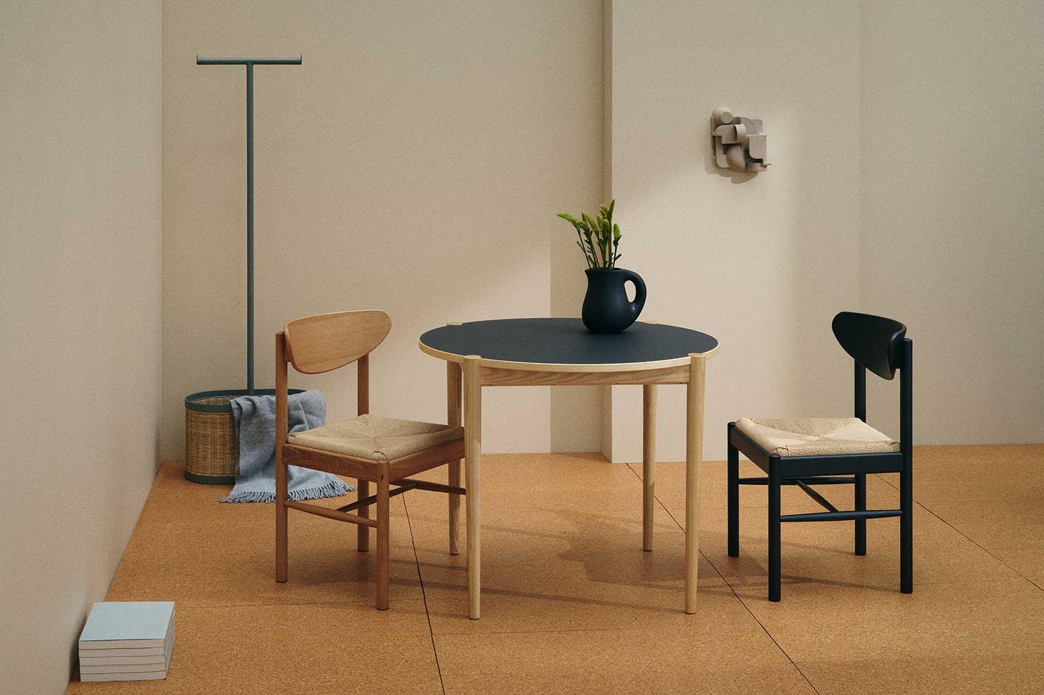 NOVA DINING TABLE ROUND 1200 Black × Charcoal, MEMOLA CHAIR Black, MEMOLA CHAIR Natural, FORM FIND STOOL Cut