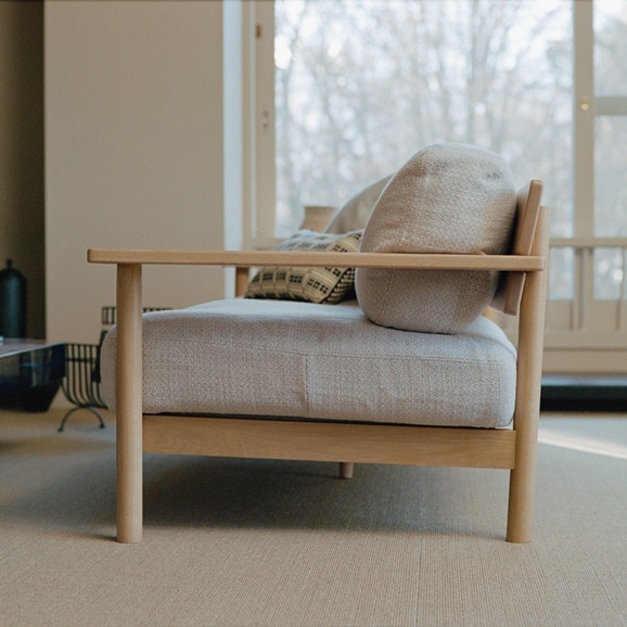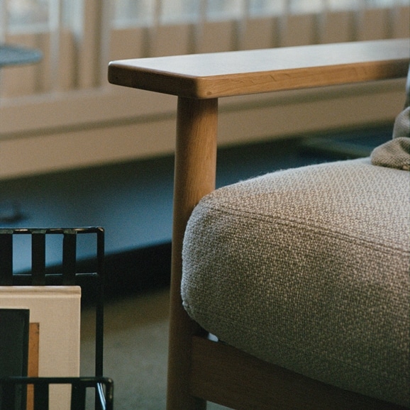 835mm(有効約560mm)と奥行がある座面と、たっぷりとフェザーが入ったクッションで、贅沢なくつろぎを実現しました。オークを使用した幅広のアームボードは、ひじを置いてリラックスしたりカップや本を置いてサイドテーブルのようにもお使いいただけます。