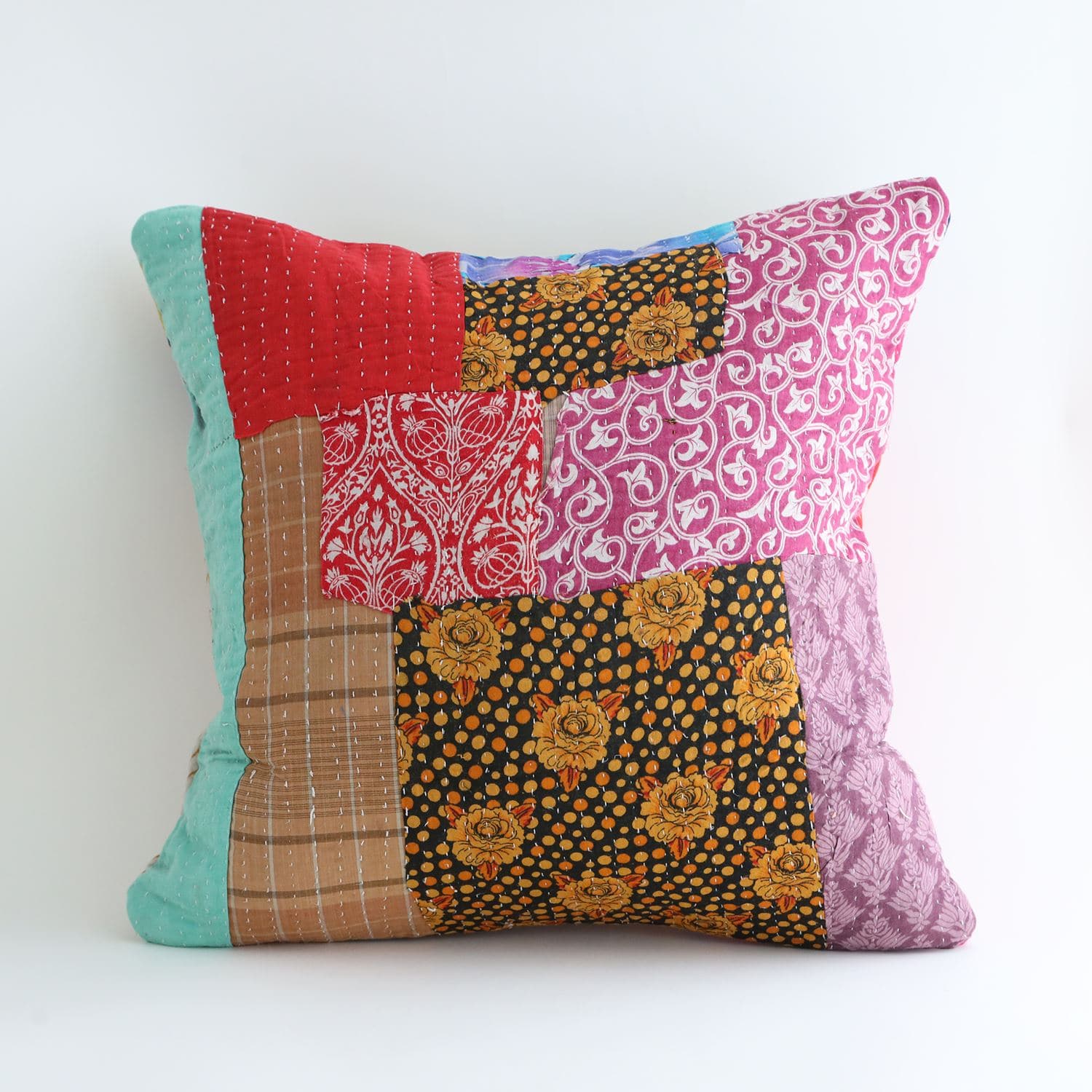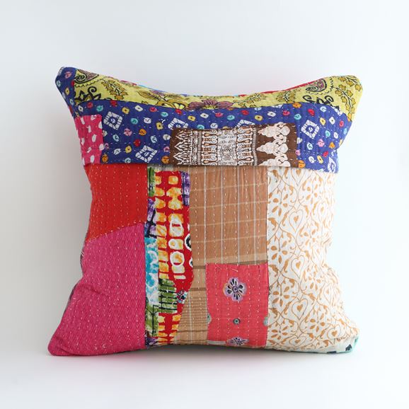 ラリーキルトを使ったクッションカバーです。ラリーキルトは、インド・パキスタンなどの中東アジアで、永い間受け継がれてきた伝統的な布です。古くなったサリーやデュパタ、腰布・古いハギレ等を貼り合わせてパッチワークし、丁寧に刺し子で合わせたもの。インダス河流域の遊牧民の家々では、嫁入り道具として母親から娘へ受け継がれています。気の遠くなるような作業を経て、わが子へ想いをこめて手渡します。一枚一枚に物語があって、何千年にも渡り母から娘へと伝えられる品。布の貼り合わせ方、刺し子の細やかさ、生地の厚みや柄など1つとして同じものはありません。丁寧にハンドメイドで作られているからこその味わいと魅力があります。