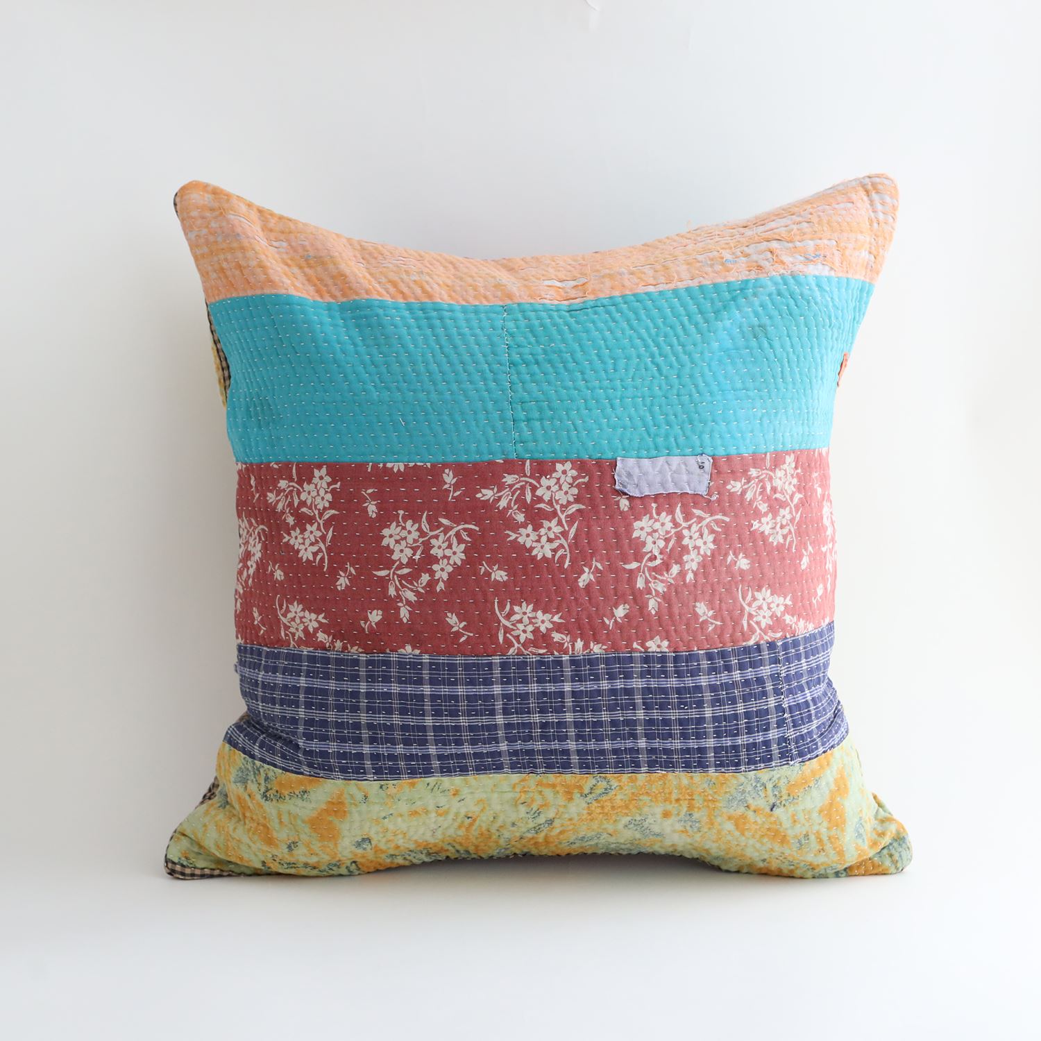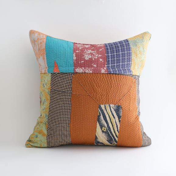 ラリーキルトを使ったクッションカバーです。ラリーキルトは、インド・パキスタンなどの中東アジアで、永い間受け継がれてきた伝統的な布です。古くなったサリーやデュパタ、腰布・古いハギレ等を貼り合わせてパッチワークし、丁寧に刺し子で合わせたもの。インダス河流域の遊牧民の家々では、嫁入り道具として母親から娘へ受け継がれています。気の遠くなるような作業を経て、わが子へ想いをこめて手渡します。一枚一枚に物語があって、何千年にも渡り母から娘へと伝えられる品。布の貼り合わせ方、刺し子の細やかさ、生地の厚みや柄など1つとして同じものはありません。丁寧にハンドメイドで作られているからこその味わいと魅力があります。