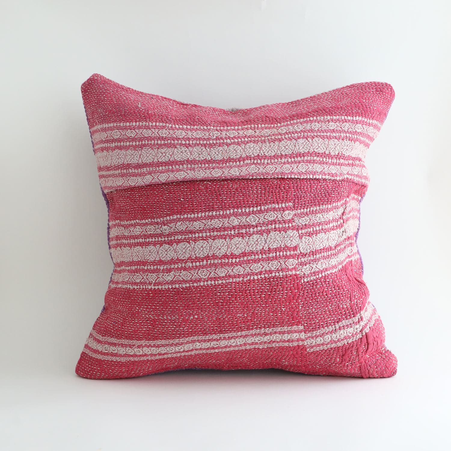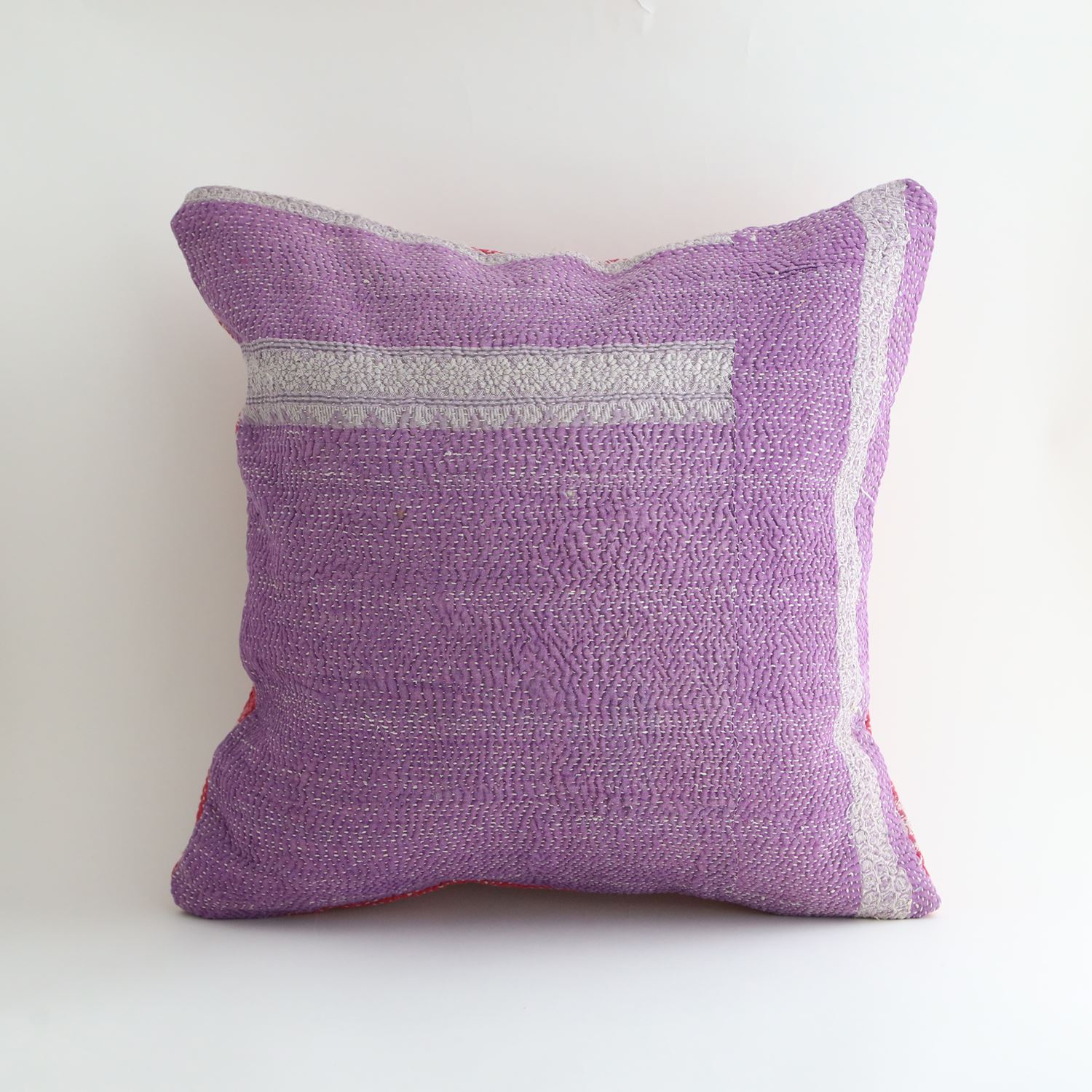 ラリーキルトを使ったクッションカバーです。ラリーキルトは、インド・パキスタンなどの中東アジアで、永い間受け継がれてきた伝統的な布です。古くなったサリーやデュパタ、腰布・古いハギレ等を貼り合わせてパッチワークし、丁寧に刺し子で合わせたもの。インダス河流域の遊牧民の家々では、嫁入り道具として母親から娘へ受け継がれています。気の遠くなるような作業を経て、わが子へ想いをこめて手渡します。一枚一枚に物語があって、何千年にも渡り母から娘へと伝えられる品。布の貼り合わせ方、刺し子の細やかさ、生地の厚みや柄など1つとして同じものはありません。丁寧にハンドメイドで作られているからこその味わいと魅力があります。