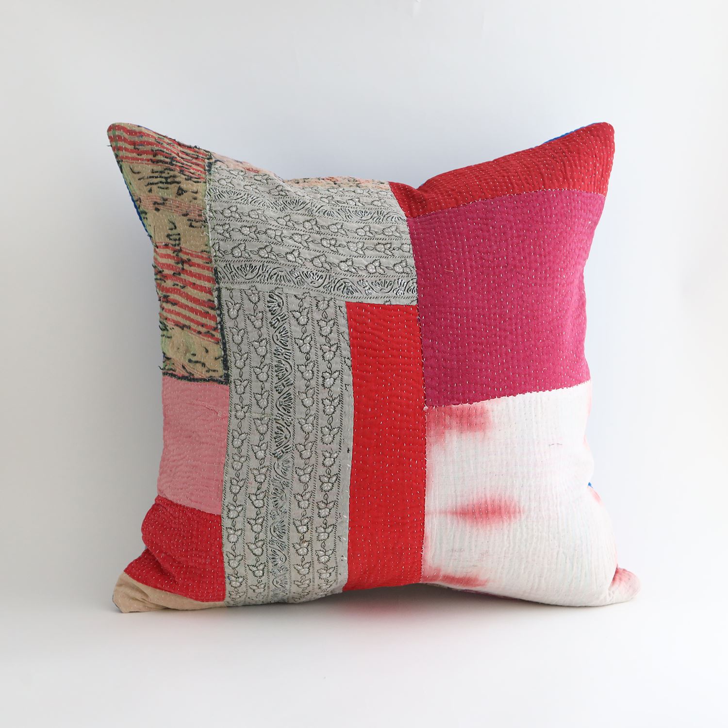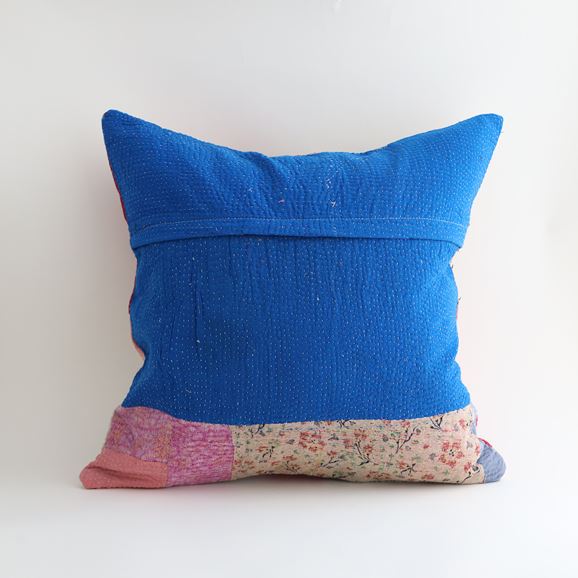 ラリーキルトを使ったクッションカバーです。ラリーキルトは、インド・パキスタンなどの中東アジアで、永い間受け継がれてきた伝統的な布です。古くなったサリーやデュパタ、腰布・古いハギレ等を貼り合わせてパッチワークし、丁寧に刺し子で合わせたもの。インダス河流域の遊牧民の家々では、嫁入り道具として母親から娘へ受け継がれています。気の遠くなるような作業を経て、わが子へ想いをこめて手渡します。一枚一枚に物語があって、何千年にも渡り母から娘へと伝えられる品。布の貼り合わせ方、刺し子の細やかさ、生地の厚みや柄など1つとして同じものはありません。丁寧にハンドメイドで作られているからこその味わいと魅力があります。