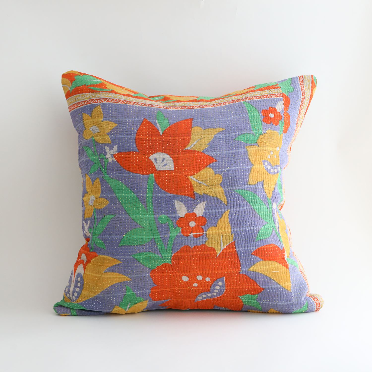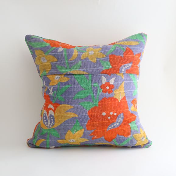 ラリーキルトを使ったクッションカバーです。ラリーキルトは、インド・パキスタンなどの中東アジアで、永い間受け継がれてきた伝統的な布です。古くなったサリーやデュパタ、腰布・古いハギレ等を貼り合わせてパッチワークし、丁寧に刺し子で合わせたもの。インダス河流域の遊牧民の家々では、嫁入り道具として母親から娘へ受け継がれています。気の遠くなるような作業を経て、わが子へ想いをこめて手渡します。一枚一枚に物語があって、何千年にも渡り母から娘へと伝えられる品。布の貼り合わせ方、刺し子の細やかさ、生地の厚みや柄など1つとして同じものはありません。丁寧にハンドメイドで作られているからこその味わいと魅力があります。