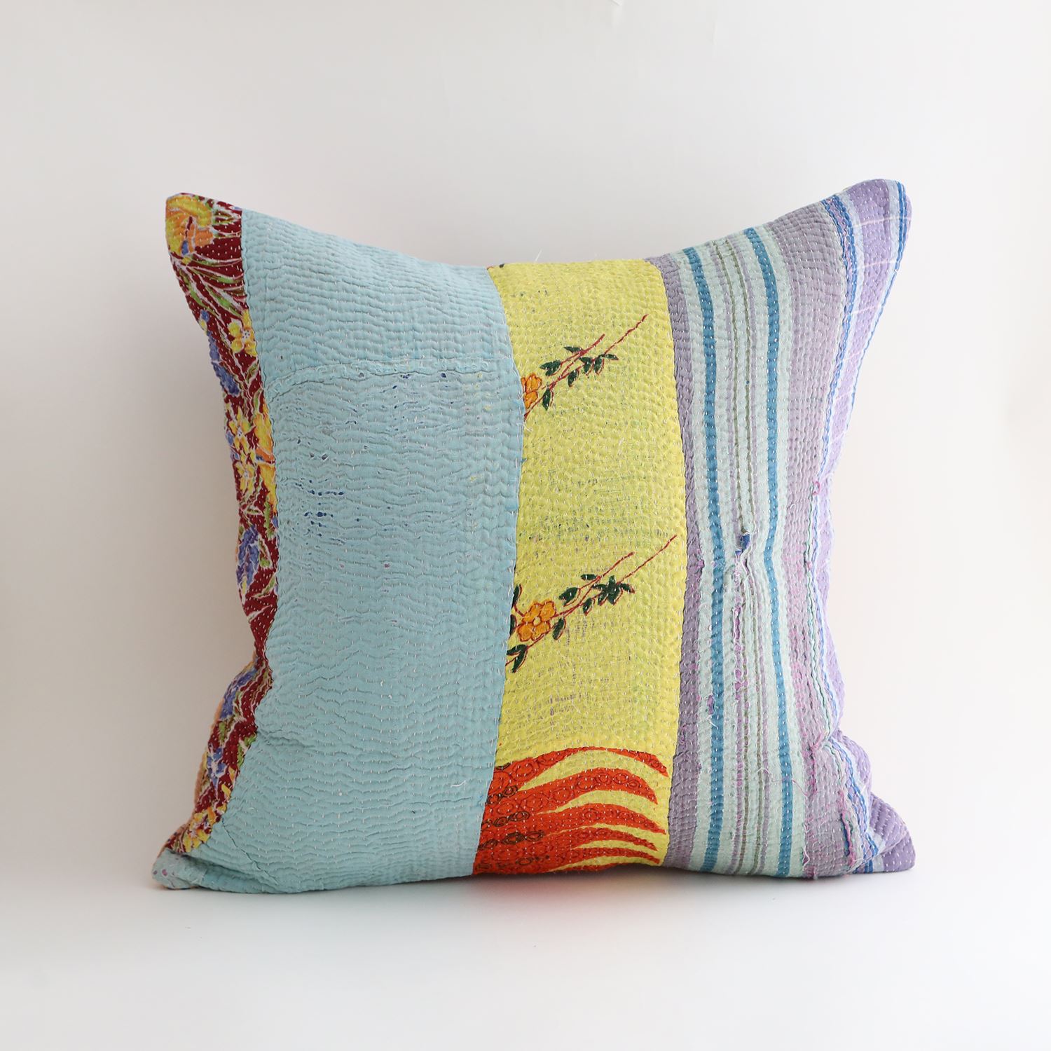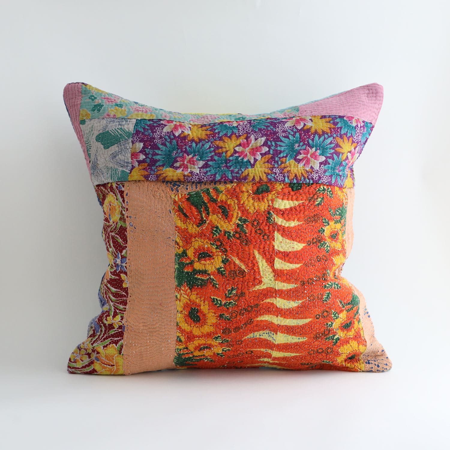ラリーキルトを使ったクッションカバーです。ラリーキルトは、インド・パキスタンなどの中東アジアで、永い間受け継がれてきた伝統的な布です。古くなったサリーやデュパタ、腰布・古いハギレ等を貼り合わせてパッチワークし、丁寧に刺し子で合わせたもの。インダス河流域の遊牧民の家々では、嫁入り道具として母親から娘へ受け継がれています。気の遠くなるような作業を経て、わが子へ想いをこめて手渡します。一枚一枚に物語があって、何千年にも渡り母から娘へと伝えられる品。布の貼り合わせ方、刺し子の細やかさ、生地の厚みや柄など1つとして同じものはありません。丁寧にハンドメイドで作られているからこその味わいと魅力があります。