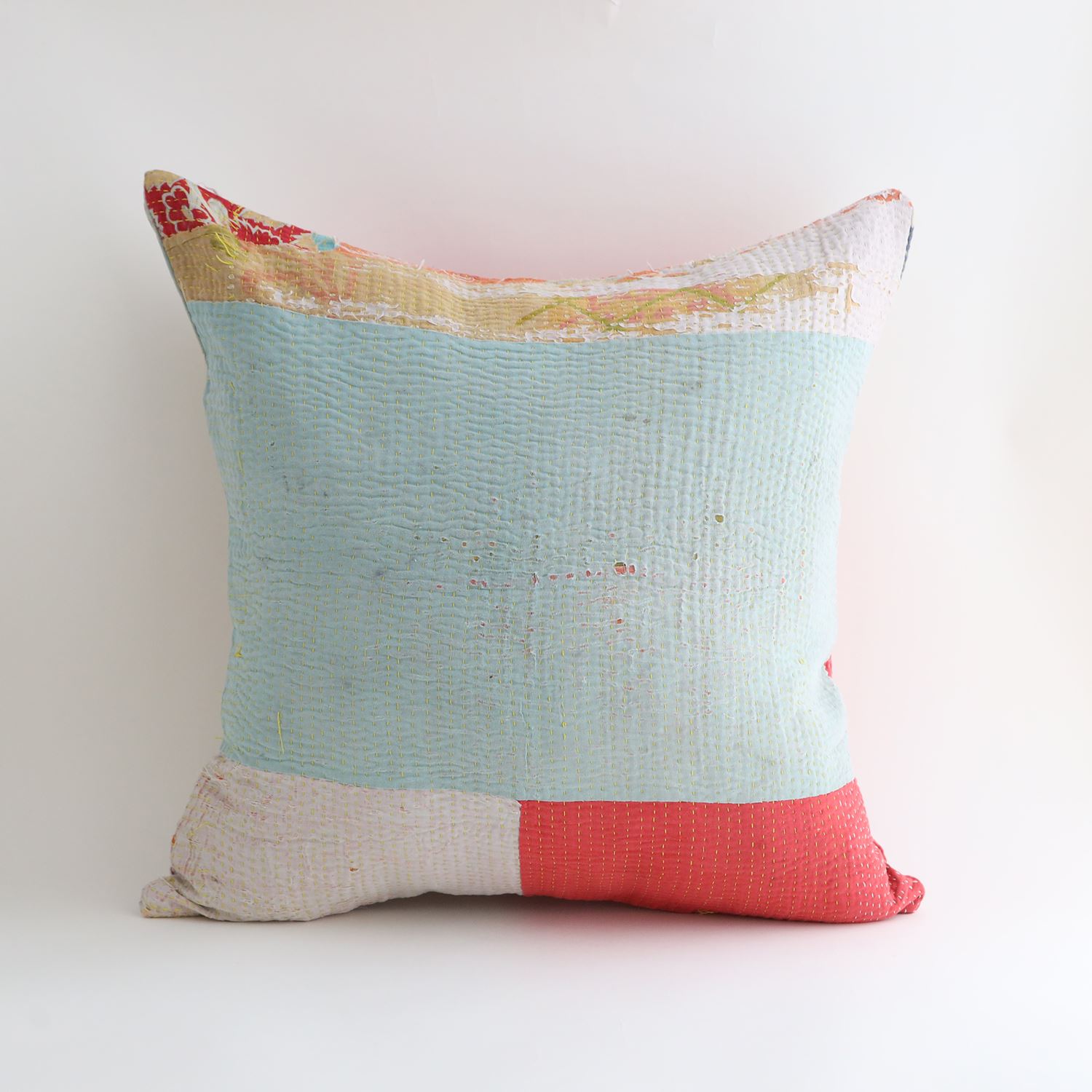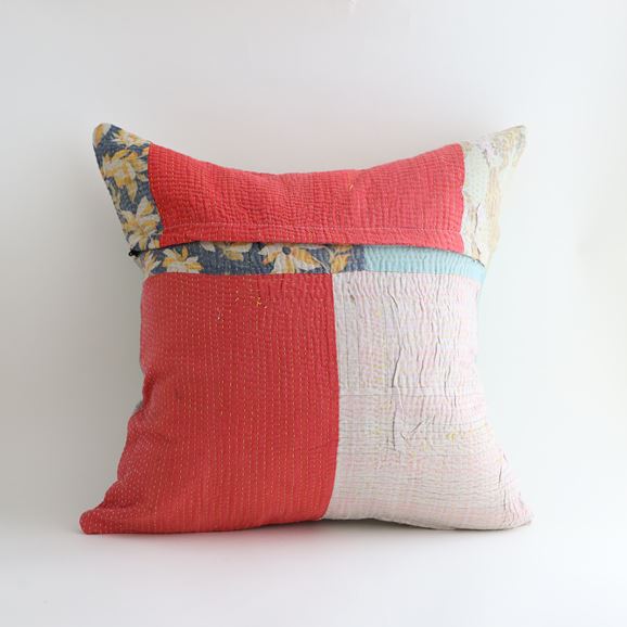 ラリーキルトを使ったクッションカバーです。ラリーキルトは、インド・パキスタンなどの中東アジアで、永い間受け継がれてきた伝統的な布です。古くなったサリーやデュパタ、腰布・古いハギレ等を貼り合わせてパッチワークし、丁寧に刺し子で合わせたもの。インダス河流域の遊牧民の家々では、嫁入り道具として母親から娘へ受け継がれています。気の遠くなるような作業を経て、わが子へ想いをこめて手渡します。一枚一枚に物語があって、何千年にも渡り母から娘へと伝えられる品。布の貼り合わせ方、刺し子の細やかさ、生地の厚みや柄など1つとして同じものはありません。丁寧にハンドメイドで作られているからこその味わいと魅力があります。