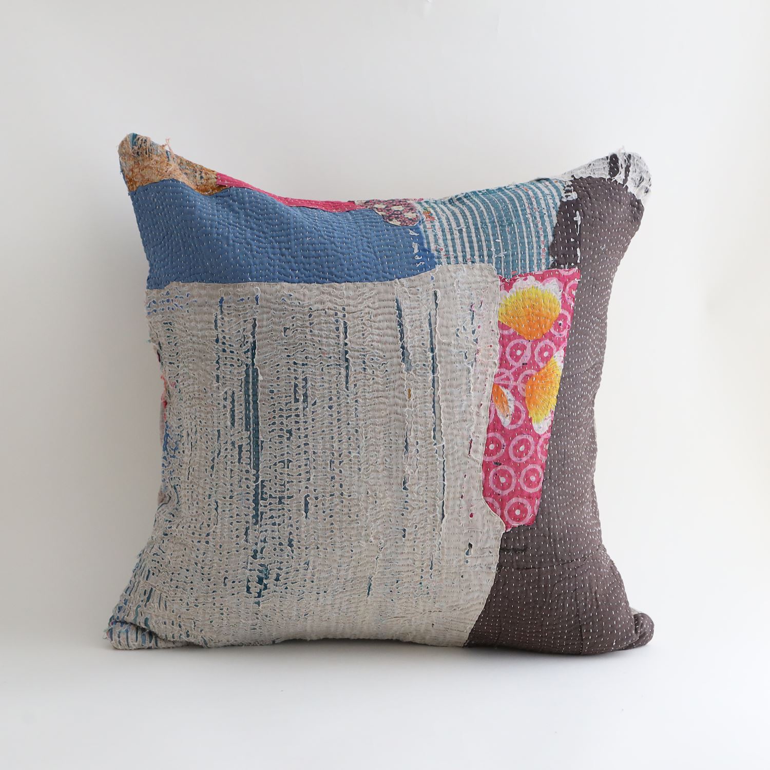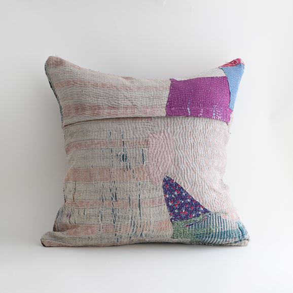 ラリーキルトを使ったクッションカバーです。ラリーキルトは、インド・パキスタンなどの中東アジアで、永い間受け継がれてきた伝統的な布です。古くなったサリーやデュパタ、腰布・古いハギレ等を貼り合わせてパッチワークし、丁寧に刺し子で合わせたもの。インダス河流域の遊牧民の家々では、嫁入り道具として母親から娘へ受け継がれています。気の遠くなるような作業を経て、わが子へ想いをこめて手渡します。一枚一枚に物語があって、何千年にも渡り母から娘へと伝えられる品。布の貼り合わせ方、刺し子の細やかさ、生地の厚みや柄など1つとして同じものはありません。丁寧にハンドメイドで作られているからこその味わいと魅力があります。