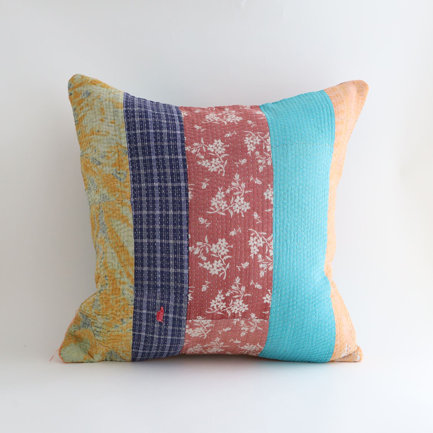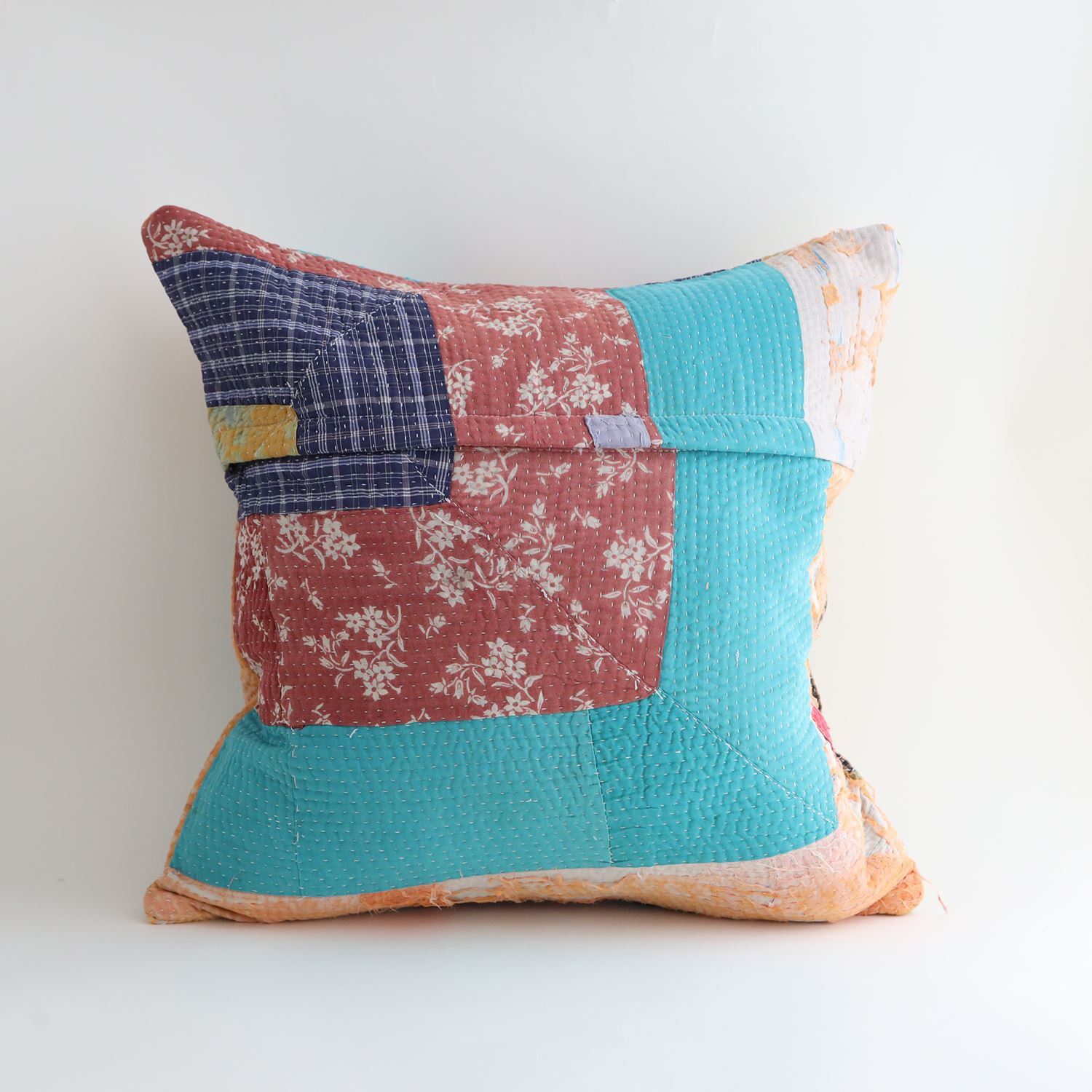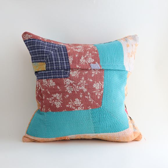 ラリーキルトを使ったクッションカバーです。ラリーキルトは、インド・パキスタンなどの中東アジアで、永い間受け継がれてきた伝統的な布です。古くなったサリーやデュパタ、腰布・古いハギレ等を貼り合わせてパッチワークし、丁寧に刺し子で合わせたもの。インダス河流域の遊牧民の家々では、嫁入り道具として母親から娘へ受け継がれています。気の遠くなるような作業を経て、わが子へ想いをこめて手渡します。一枚一枚に物語があって、何千年にも渡り母から娘へと伝えられる品。布の貼り合わせ方、刺し子の細やかさ、生地の厚みや柄など1つとして同じものはありません。丁寧にハンドメイドで作られているからこその味わいと魅力があります。