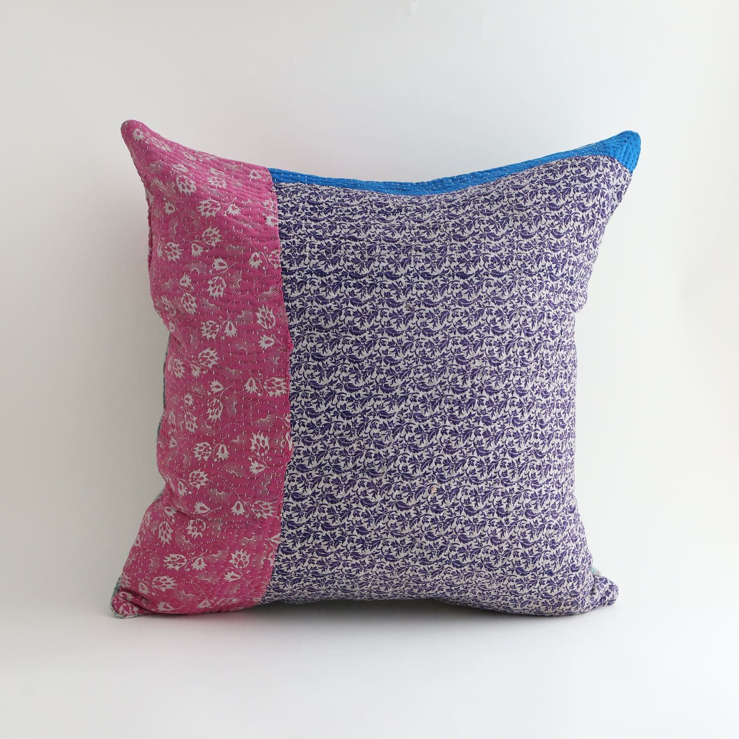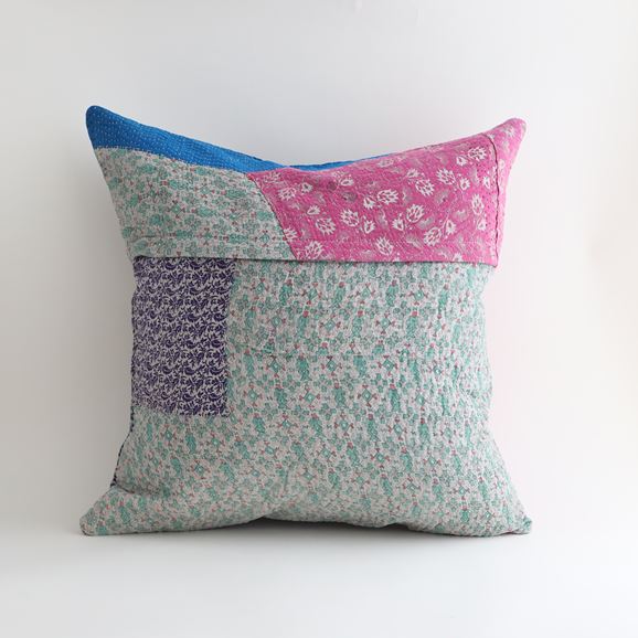 ラリーキルトを使ったクッションカバーです。ラリーキルトは、インド・パキスタンなどの中東アジアで、永い間受け継がれてきた伝統的な布です。古くなったサリーやデュパタ、腰布・古いハギレ等を貼り合わせてパッチワークし、丁寧に刺し子で合わせたもの。インダス河流域の遊牧民の家々では、嫁入り道具として母親から娘へ受け継がれています。気の遠くなるような作業を経て、わが子へ想いをこめて手渡します。一枚一枚に物語があって、何千年にも渡り母から娘へと伝えられる品。布の貼り合わせ方、刺し子の細やかさ、生地の厚みや柄など1つとして同じものはありません。丁寧にハンドメイドで作られているからこその味わいと魅力があります。