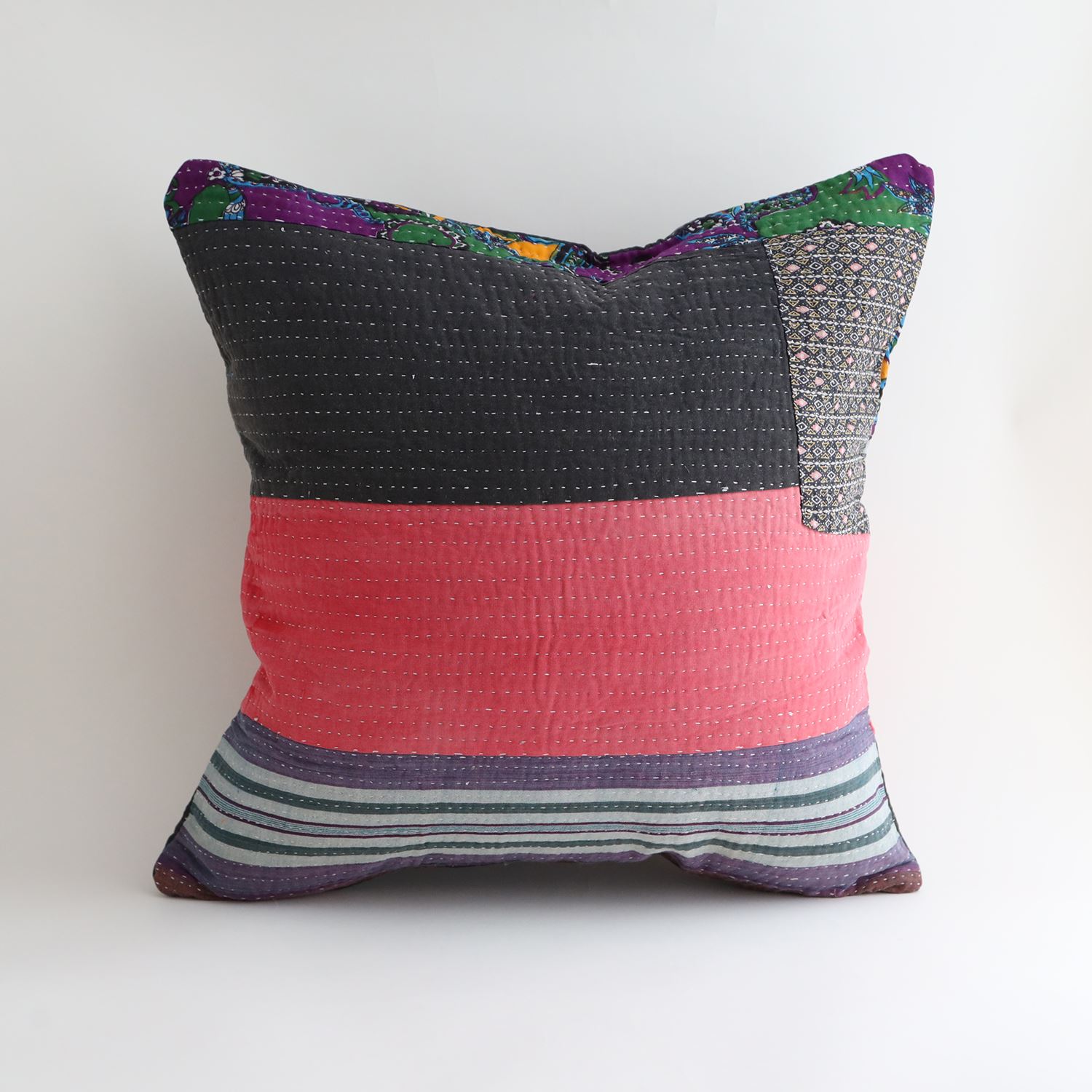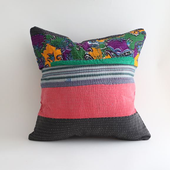 ラリーキルトを使ったクッションカバーです。ラリーキルトは、インド・パキスタンなどの中東アジアで、永い間受け継がれてきた伝統的な布です。古くなったサリーやデュパタ、腰布・古いハギレ等を貼り合わせてパッチワークし、丁寧に刺し子で合わせたもの。インダス河流域の遊牧民の家々では、嫁入り道具として母親から娘へ受け継がれています。気の遠くなるような作業を経て、わが子へ想いをこめて手渡します。一枚一枚に物語があって、何千年にも渡り母から娘へと伝えられる品。布の貼り合わせ方、刺し子の細やかさ、生地の厚みや柄など1つとして同じものはありません。丁寧にハンドメイドで作られているからこその味わいと魅力があります。