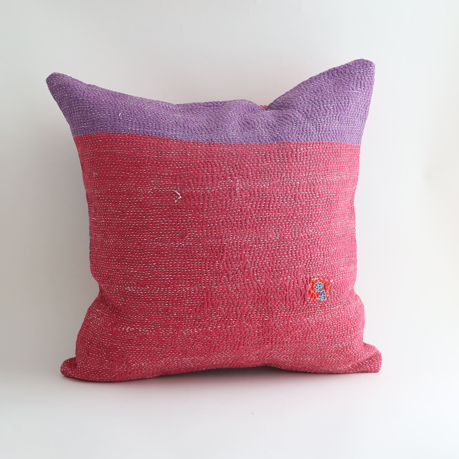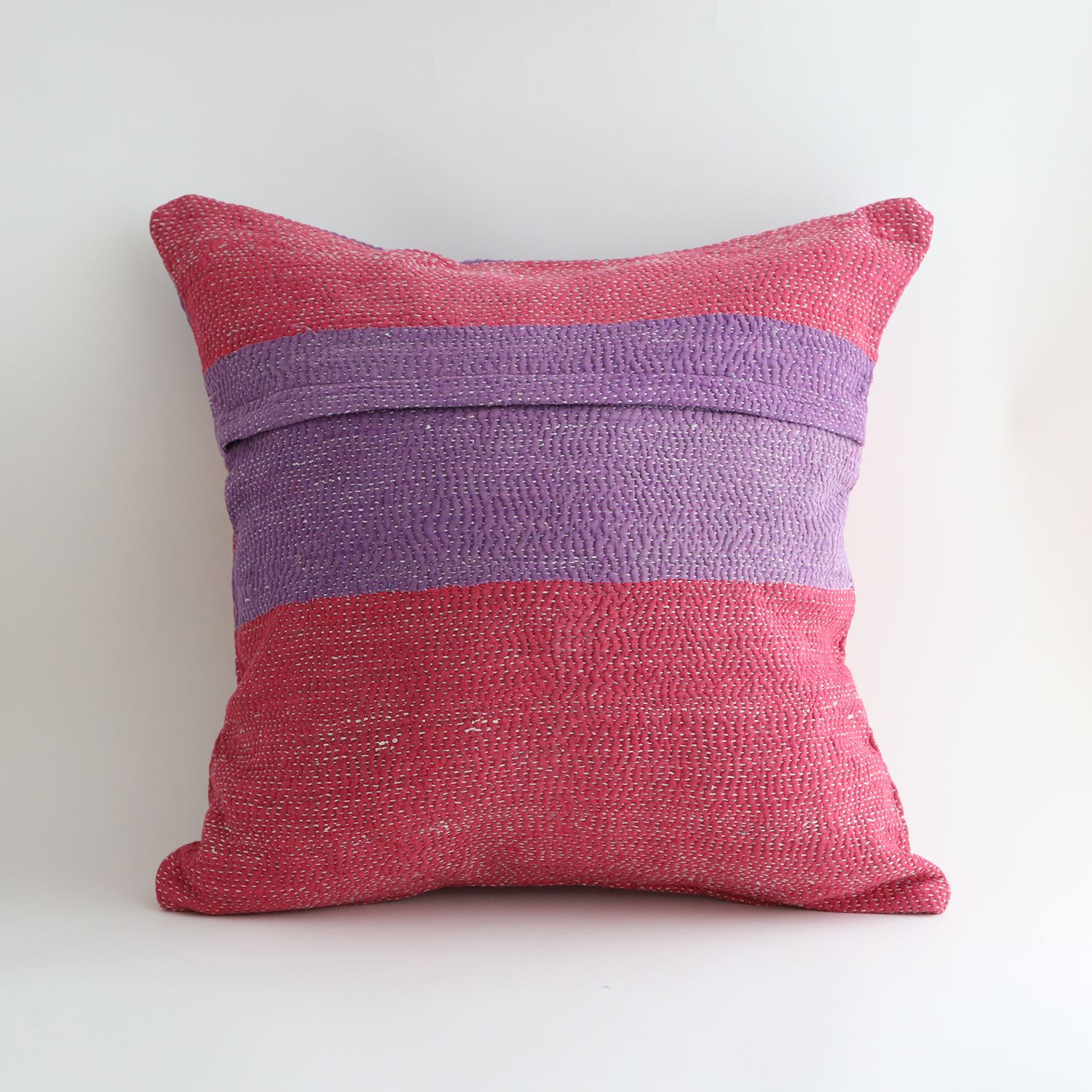 ラリーキルトを使ったクッションカバーです。ラリーキルトは、インド・パキスタンなどの中東アジアで、永い間受け継がれてきた伝統的な布です。古くなったサリーやデュパタ、腰布・古いハギレ等を貼り合わせてパッチワークし、丁寧に刺し子で合わせたもの。インダス河流域の遊牧民の家々では、嫁入り道具として母親から娘へ受け継がれています。気の遠くなるような作業を経て、わが子へ想いをこめて手渡します。一枚一枚に物語があって、何千年にも渡り母から娘へと伝えられる品。布の貼り合わせ方、刺し子の細やかさ、生地の厚みや柄など1つとして同じものはありません。丁寧にハンドメイドで作られているからこその味わいと魅力があります。