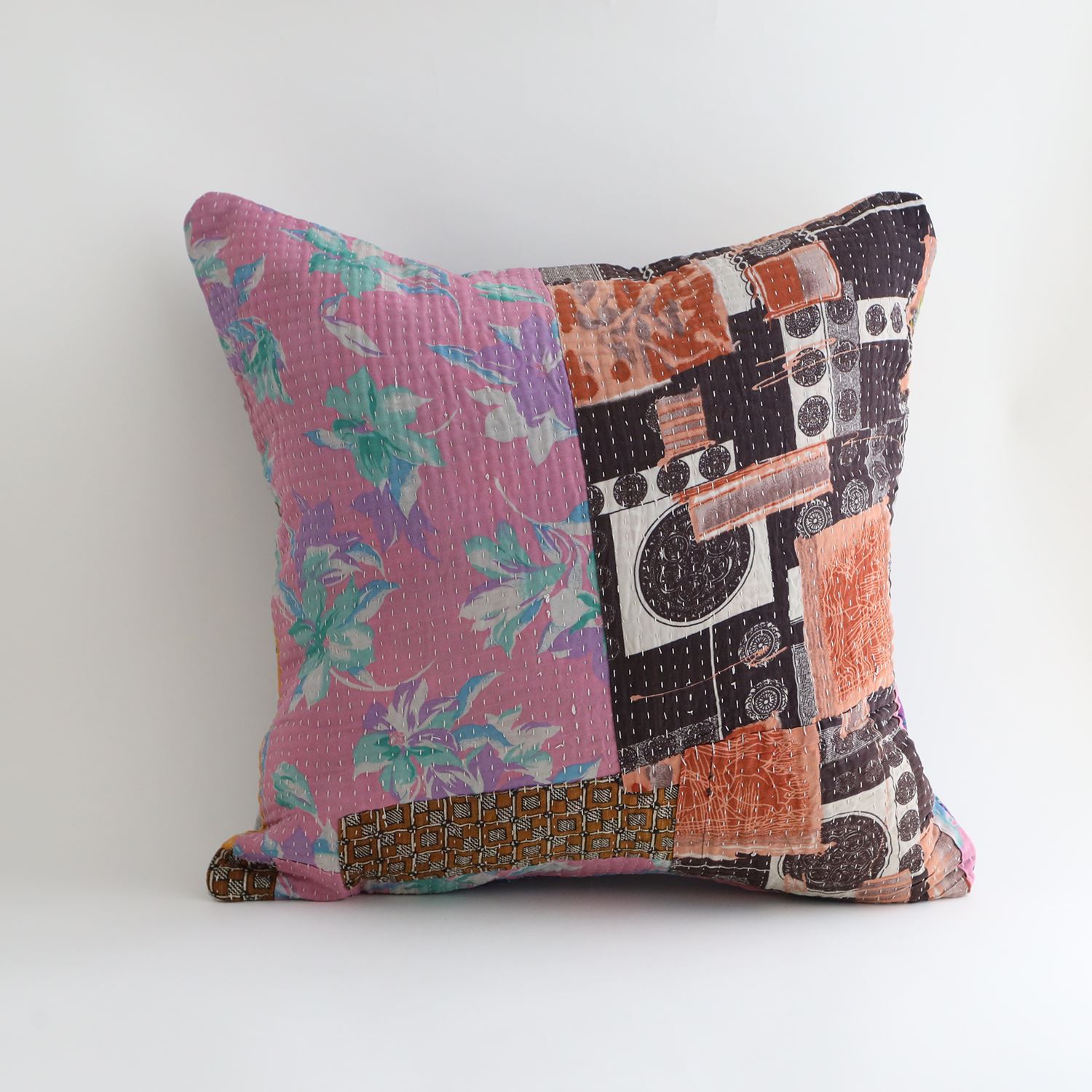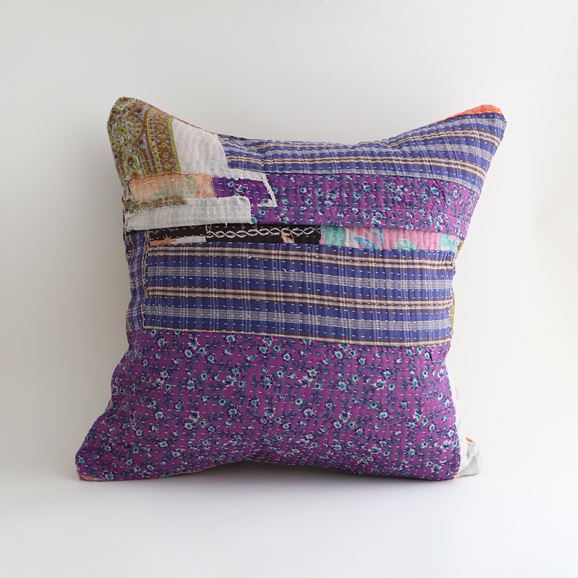 ラリーキルトを使ったクッションカバーです。ラリーキルトは、インド・パキスタンなどの中東アジアで、永い間受け継がれてきた伝統的な布です。古くなったサリーやデュパタ、腰布・古いハギレ等を貼り合わせてパッチワークし、丁寧に刺し子で合わせたもの。インダス河流域の遊牧民の家々では、嫁入り道具として母親から娘へ受け継がれています。気の遠くなるような作業を経て、わが子へ想いをこめて手渡します。一枚一枚に物語があって、何千年にも渡り母から娘へと伝えられる品。布の貼り合わせ方、刺し子の細やかさ、生地の厚みや柄など1つとして同じものはありません。丁寧にハンドメイドで作られているからこその味わいと魅力があります。