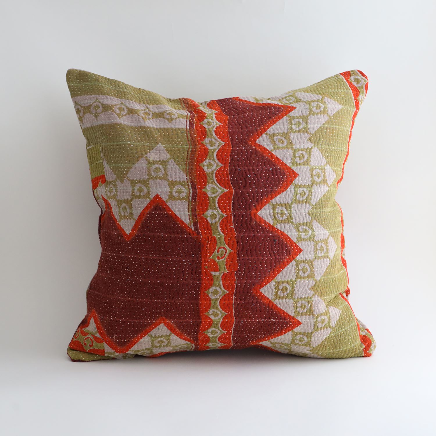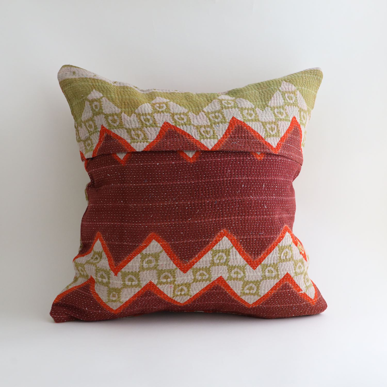 ラリーキルトを使ったクッションカバーです。ラリーキルトは、インド・パキスタンなどの中東アジアで、永い間受け継がれてきた伝統的な布です。古くなったサリーやデュパタ、腰布・古いハギレ等を貼り合わせてパッチワークし、丁寧に刺し子で合わせたもの。インダス河流域の遊牧民の家々では、嫁入り道具として母親から娘へ受け継がれています。気の遠くなるような作業を経て、わが子へ想いをこめて手渡します。一枚一枚に物語があって、何千年にも渡り母から娘へと伝えられる品。布の貼り合わせ方、刺し子の細やかさ、生地の厚みや柄など1つとして同じものはありません。丁寧にハンドメイドで作られているからこその味わいと魅力があります。