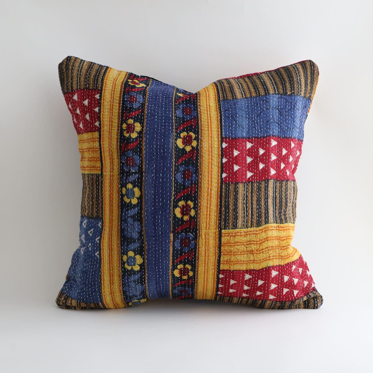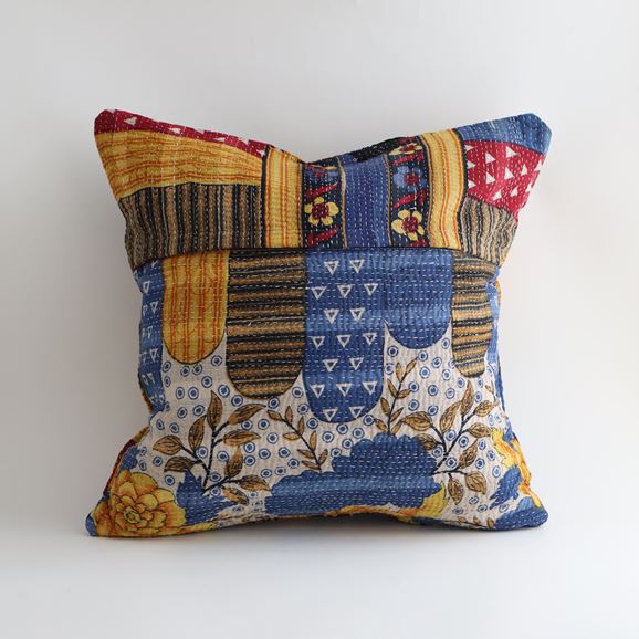 ラリーキルトを使ったクッションカバーです。ラリーキルトは、インド・パキスタンなどの中東アジアで、永い間受け継がれてきた伝統的な布です。古くなったサリーやデュパタ、腰布・古いハギレ等を貼り合わせてパッチワークし、丁寧に刺し子で合わせたもの。インダス河流域の遊牧民の家々では、嫁入り道具として母親から娘へ受け継がれています。気の遠くなるような作業を経て、わが子へ想いをこめて手渡します。一枚一枚に物語があって、何千年にも渡り母から娘へと伝えられる品。布の貼り合わせ方、刺し子の細やかさ、生地の厚みや柄など1つとして同じものはありません。丁寧にハンドメイドで作られているからこその味わいと魅力があります。