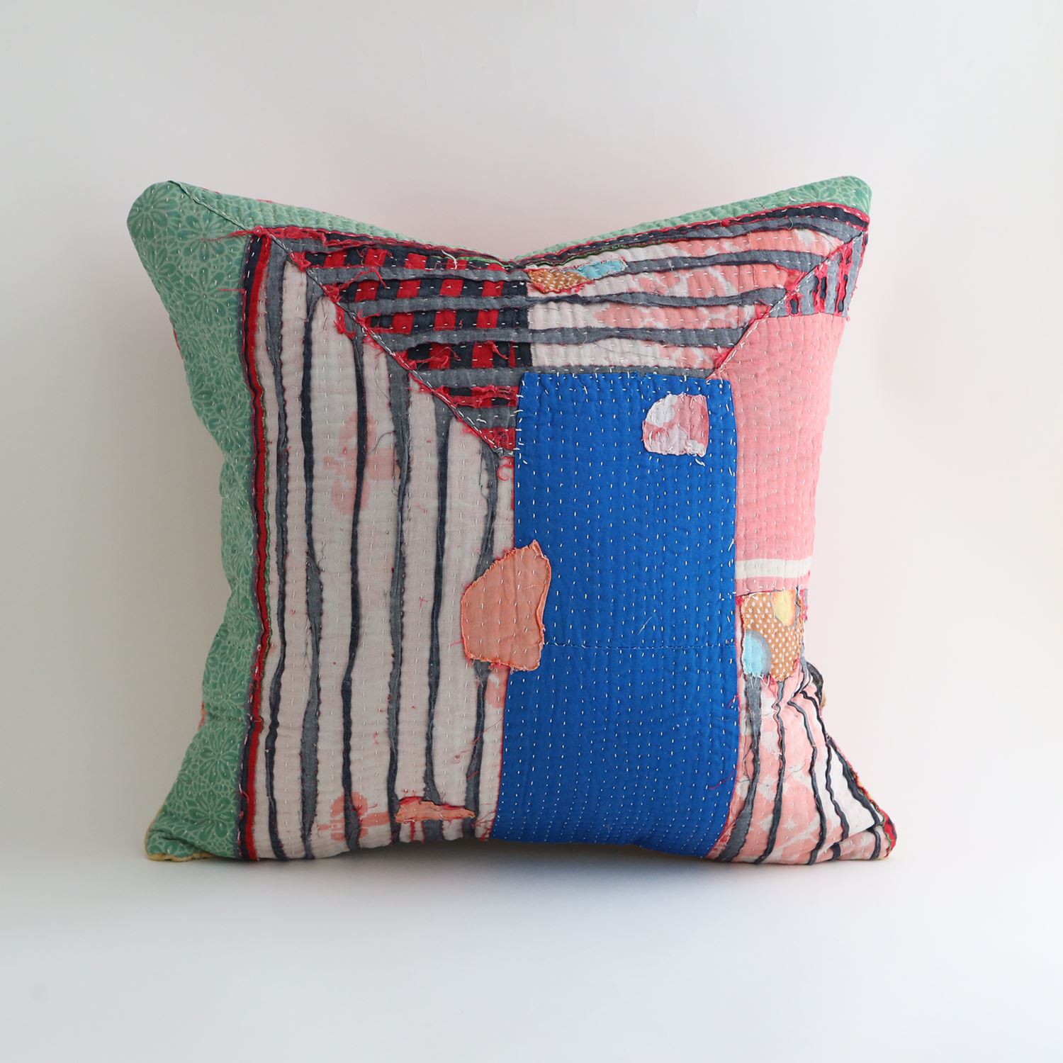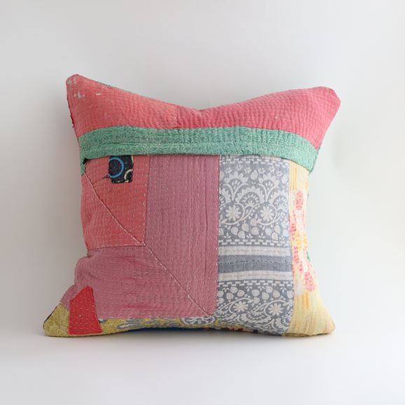 ラリーキルトを使ったクッションカバーです。ラリーキルトは、インド・パキスタンなどの中東アジアで、永い間受け継がれてきた伝統的な布です。古くなったサリーやデュパタ、腰布・古いハギレ等を貼り合わせてパッチワークし、丁寧に刺し子で合わせたもの。インダス河流域の遊牧民の家々では、嫁入り道具として母親から娘へ受け継がれています。気の遠くなるような作業を経て、わが子へ想いをこめて手渡します。一枚一枚に物語があって、何千年にも渡り母から娘へと伝えられる品。布の貼り合わせ方、刺し子の細やかさ、生地の厚みや柄など1つとして同じものはありません。丁寧にハンドメイドで作られているからこその味わいと魅力があります。