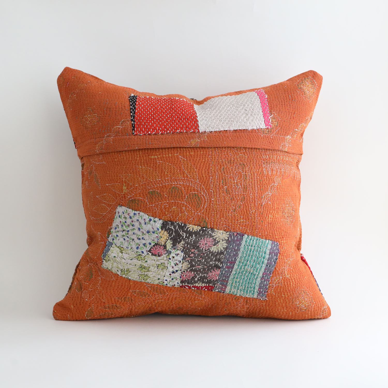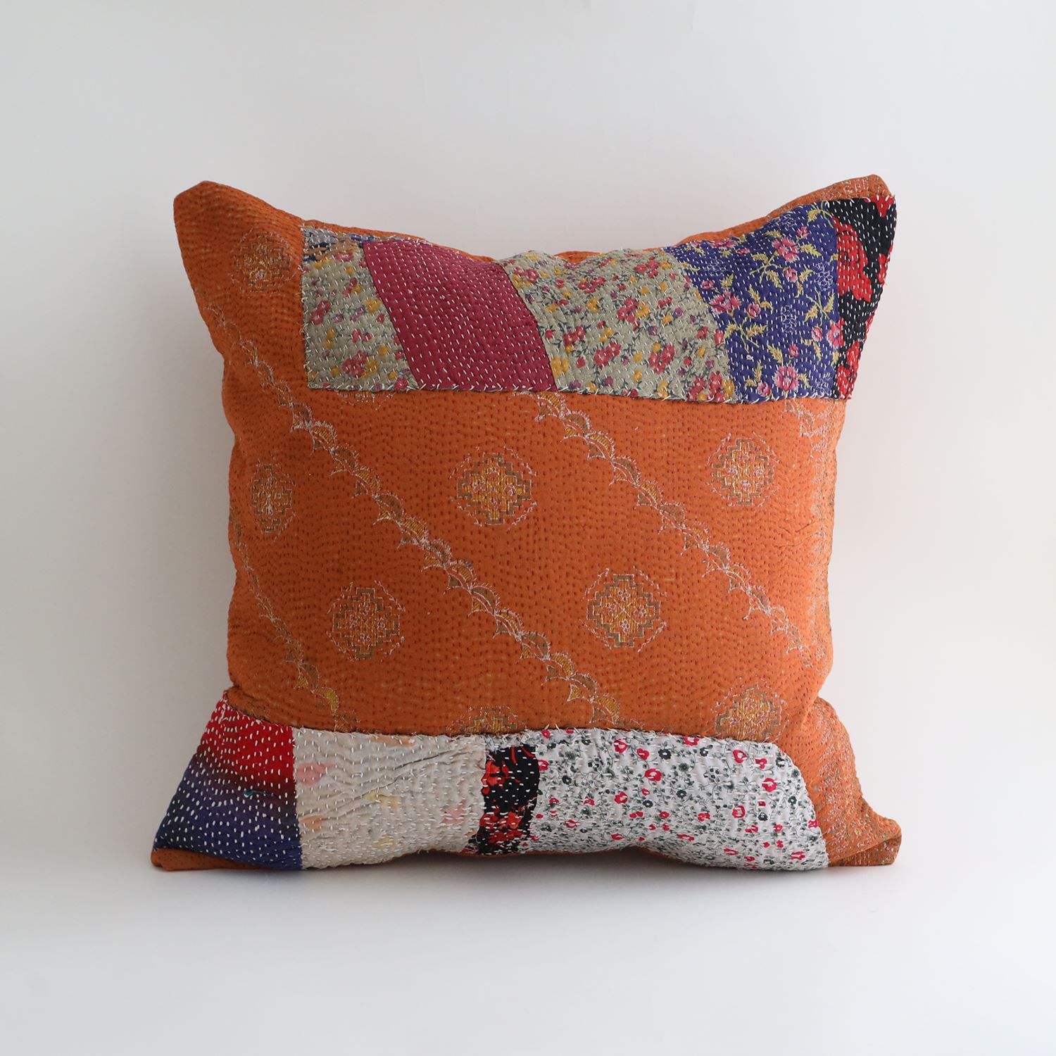 ラリーキルトを使ったクッションカバーです。ラリーキルトは、インド・パキスタンなどの中東アジアで、永い間受け継がれてきた伝統的な布です。古くなったサリーやデュパタ、腰布・古いハギレ等を貼り合わせてパッチワークし、丁寧に刺し子で合わせたもの。インダス河流域の遊牧民の家々では、嫁入り道具として母親から娘へ受け継がれています。気の遠くなるような作業を経て、わが子へ想いをこめて手渡します。一枚一枚に物語があって、何千年にも渡り母から娘へと伝えられる品。布の貼り合わせ方、刺し子の細やかさ、生地の厚みや柄など1つとして同じものはありません。丁寧にハンドメイドで作られているからこその味わいと魅力があります。