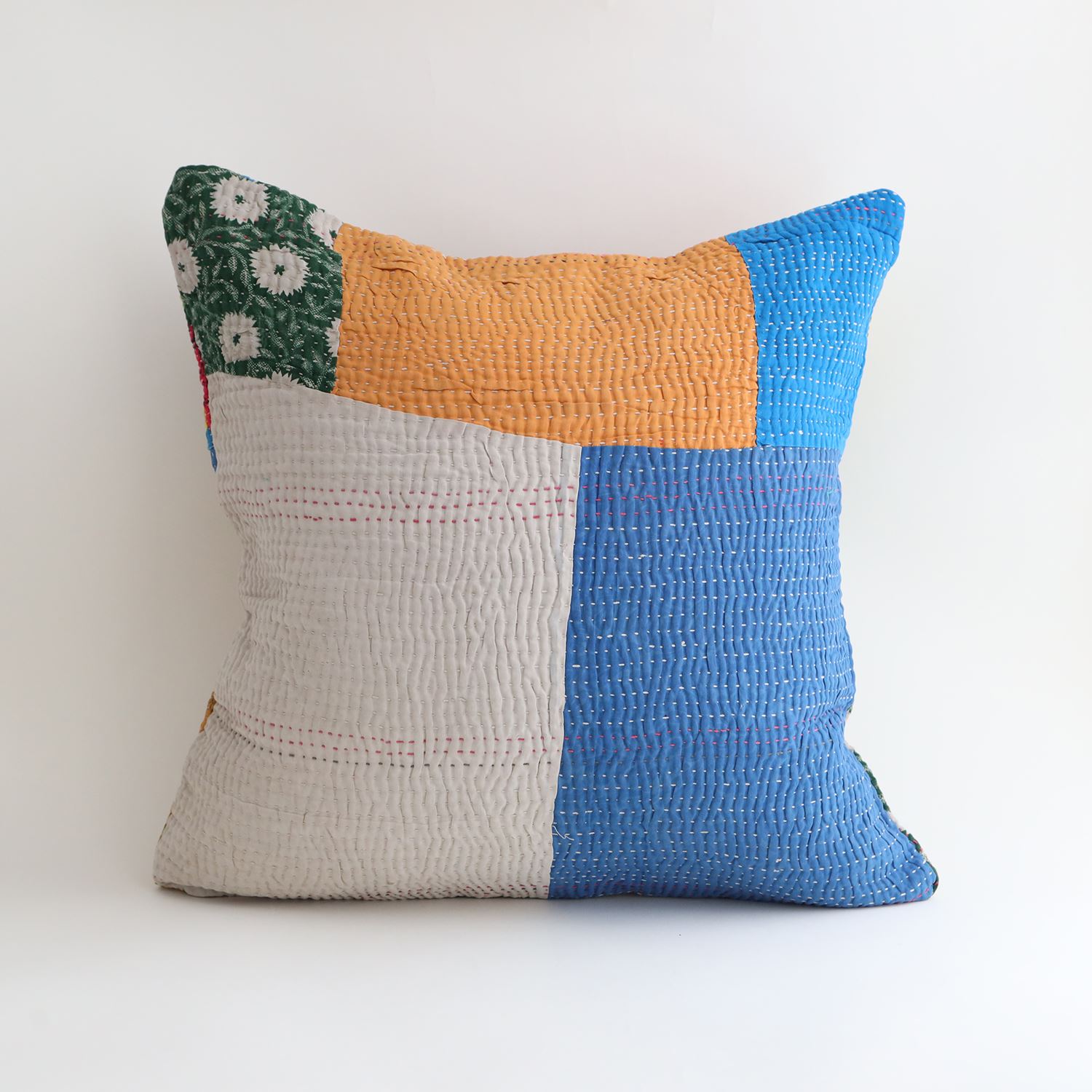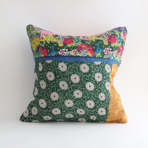 ラリーキルトを使ったクッションカバーです。ラリーキルトは、インド・パキスタンなどの中東アジアで、永い間受け継がれてきた伝統的な布です。古くなったサリーやデュパタ、腰布・古いハギレ等を貼り合わせてパッチワークし、丁寧に刺し子で合わせたもの。インダス河流域の遊牧民の家々では、嫁入り道具として母親から娘へ受け継がれています。気の遠くなるような作業を経て、わが子へ想いをこめて手渡します。一枚一枚に物語があって、何千年にも渡り母から娘へと伝えられる品。布の貼り合わせ方、刺し子の細やかさ、生地の厚みや柄など1つとして同じものはありません。丁寧にハンドメイドで作られているからこその味わいと魅力があります。