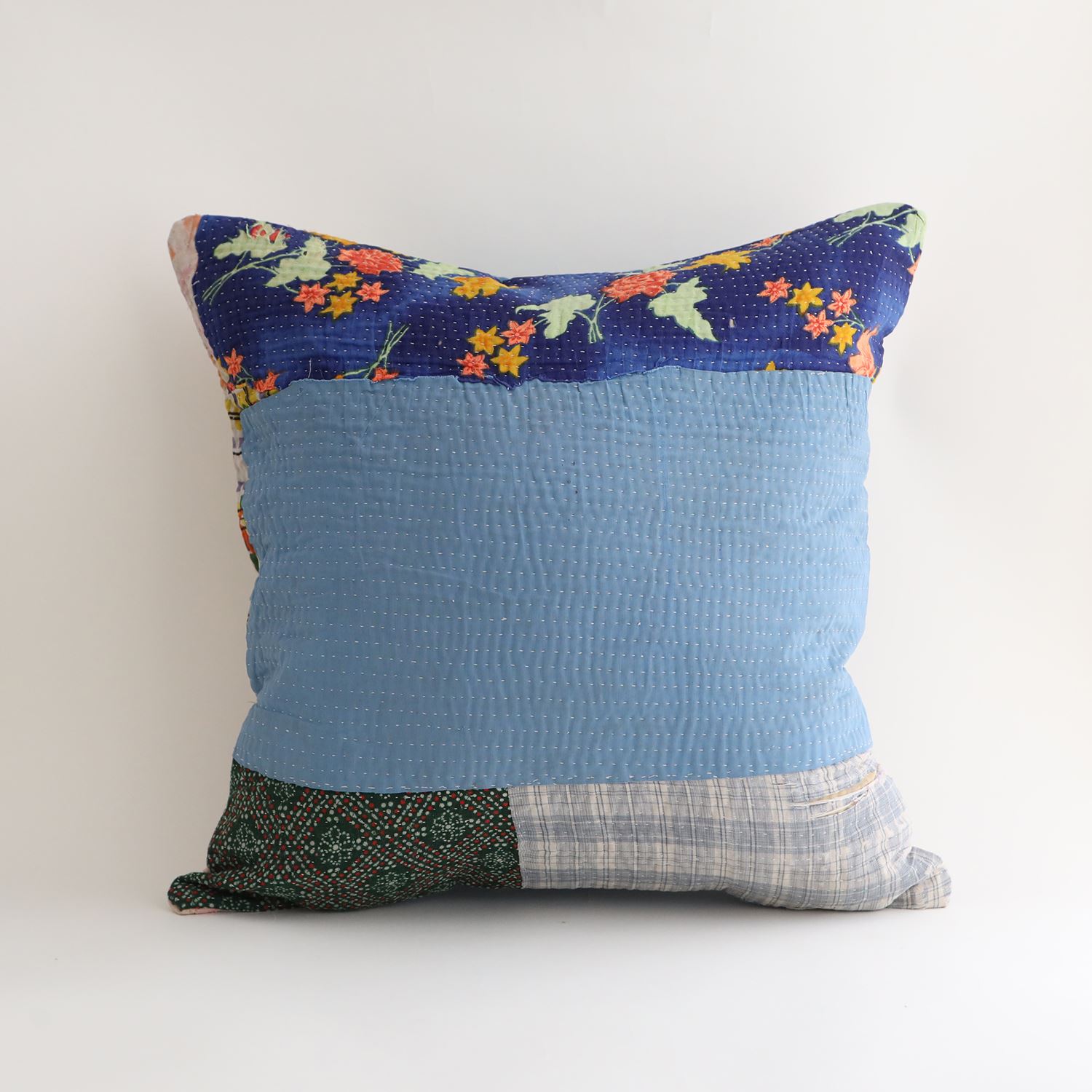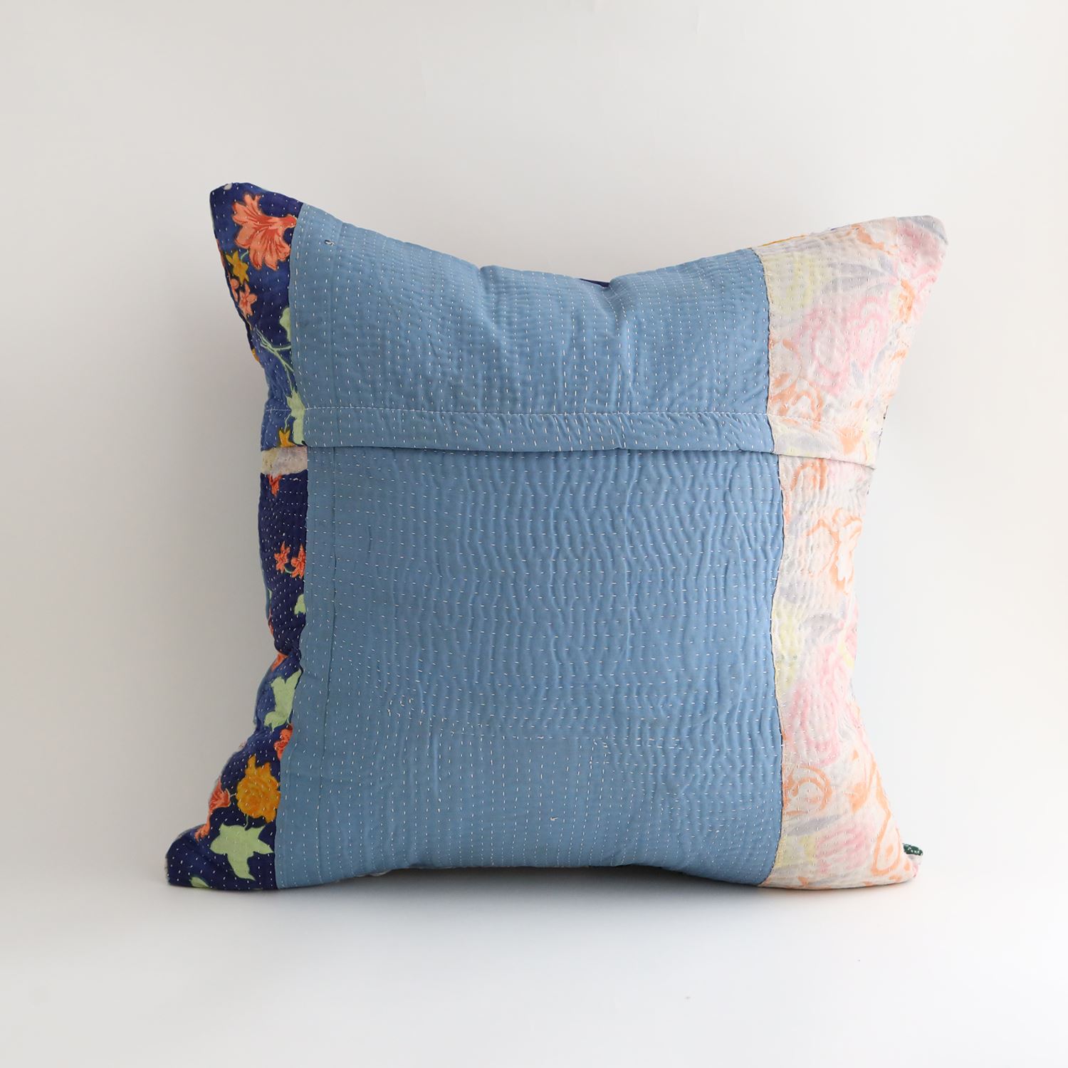 ラリーキルトを使ったクッションカバーです。ラリーキルトは、インド・パキスタンなどの中東アジアで、永い間受け継がれてきた伝統的な布です。古くなったサリーやデュパタ、腰布・古いハギレ等を貼り合わせてパッチワークし、丁寧に刺し子で合わせたもの。インダス河流域の遊牧民の家々では、嫁入り道具として母親から娘へ受け継がれています。気の遠くなるような作業を経て、わが子へ想いをこめて手渡します。一枚一枚に物語があって、何千年にも渡り母から娘へと伝えられる品。布の貼り合わせ方、刺し子の細やかさ、生地の厚みや柄など1つとして同じものはありません。丁寧にハンドメイドで作られているからこその味わいと魅力があります。