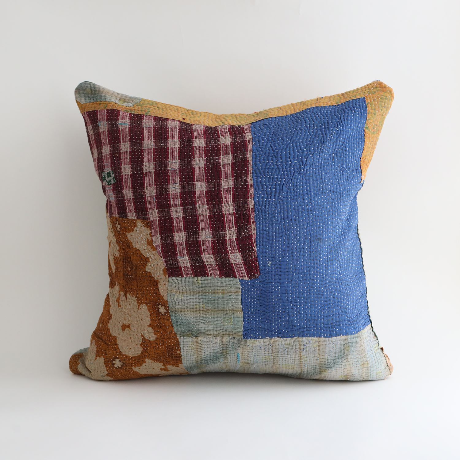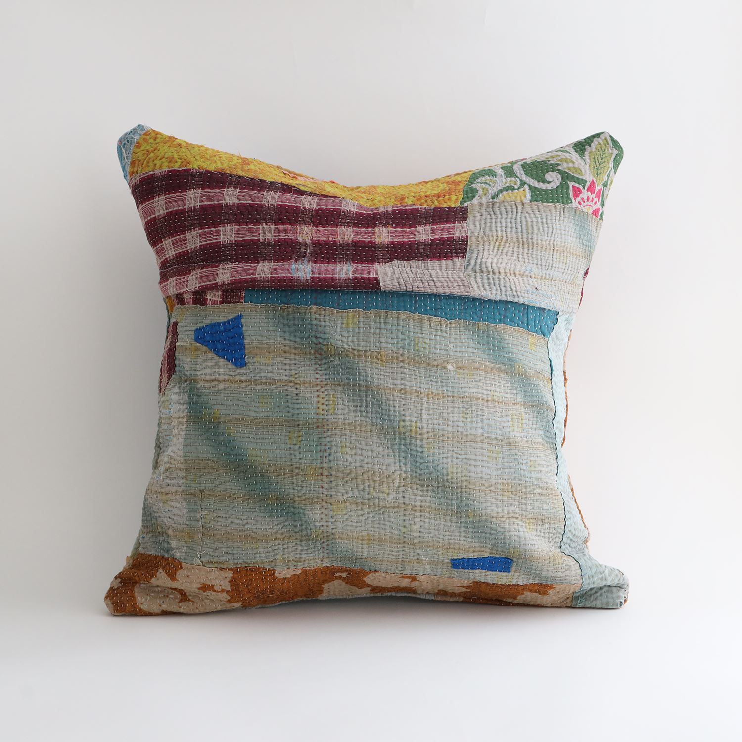 ラリーキルトを使ったクッションカバーです。ラリーキルトは、インド・パキスタンなどの中東アジアで、永い間受け継がれてきた伝統的な布です。古くなったサリーやデュパタ、腰布・古いハギレ等を貼り合わせてパッチワークし、丁寧に刺し子で合わせたもの。インダス河流域の遊牧民の家々では、嫁入り道具として母親から娘へ受け継がれています。気の遠くなるような作業を経て、わが子へ想いをこめて手渡します。一枚一枚に物語があって、何千年にも渡り母から娘へと伝えられる品。布の貼り合わせ方、刺し子の細やかさ、生地の厚みや柄など1つとして同じものはありません。丁寧にハンドメイドで作られているからこその味わいと魅力があります。