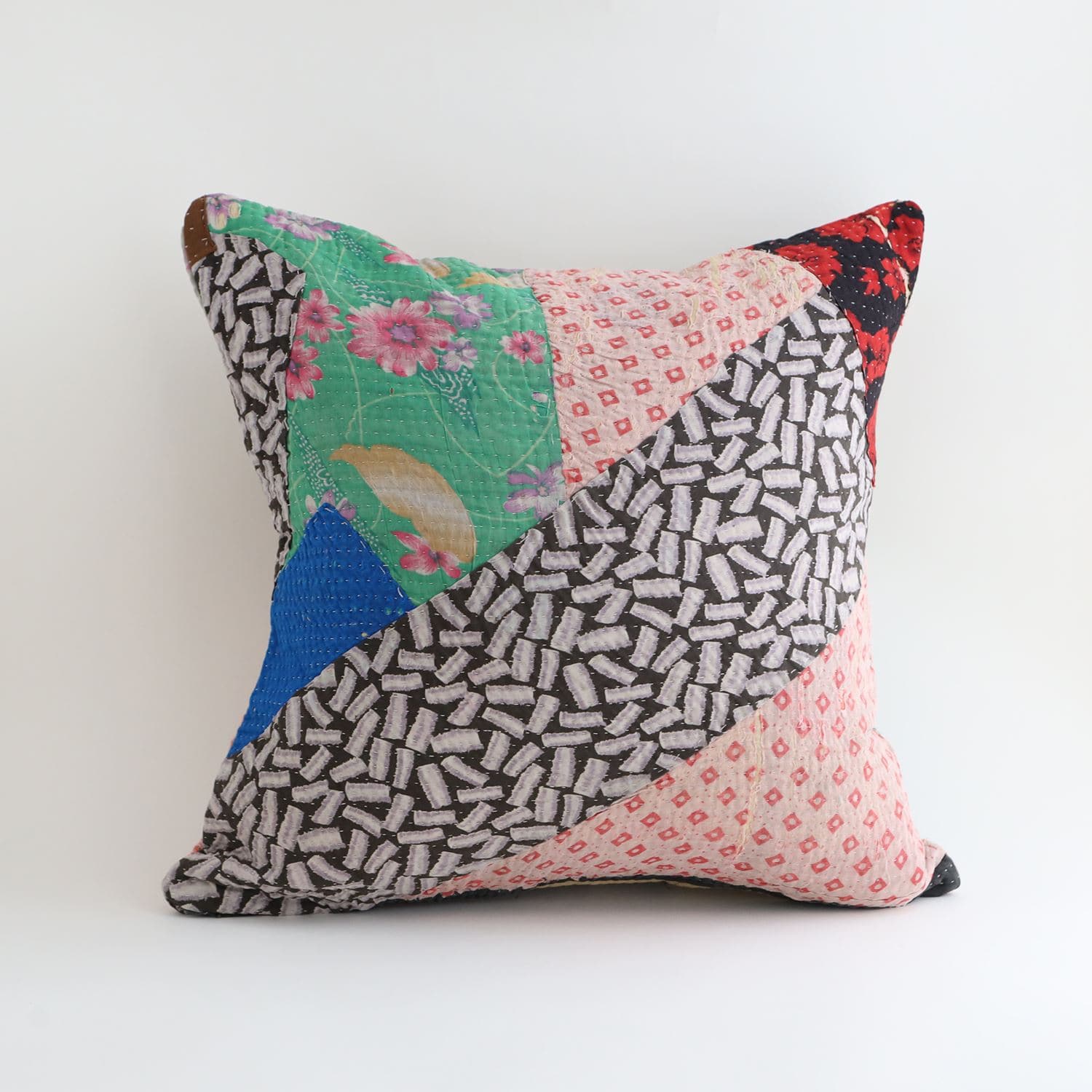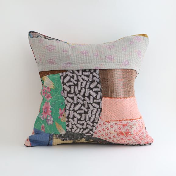 ラリーキルトを使ったクッションカバーです。ラリーキルトは、インド・パキスタンなどの中東アジアで、永い間受け継がれてきた伝統的な布です。古くなったサリーやデュパタ、腰布・古いハギレ等を貼り合わせてパッチワークし、丁寧に刺し子で合わせたもの。インダス河流域の遊牧民の家々では、嫁入り道具として母親から娘へ受け継がれています。気の遠くなるような作業を経て、わが子へ想いをこめて手渡します。一枚一枚に物語があって、何千年にも渡り母から娘へと伝えられる品。布の貼り合わせ方、刺し子の細やかさ、生地の厚みや柄など1つとして同じものはありません。丁寧にハンドメイドで作られているからこその味わいと魅力があります。