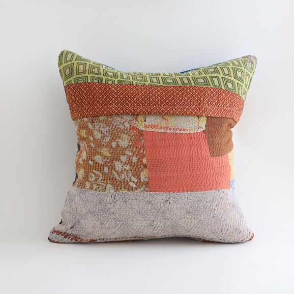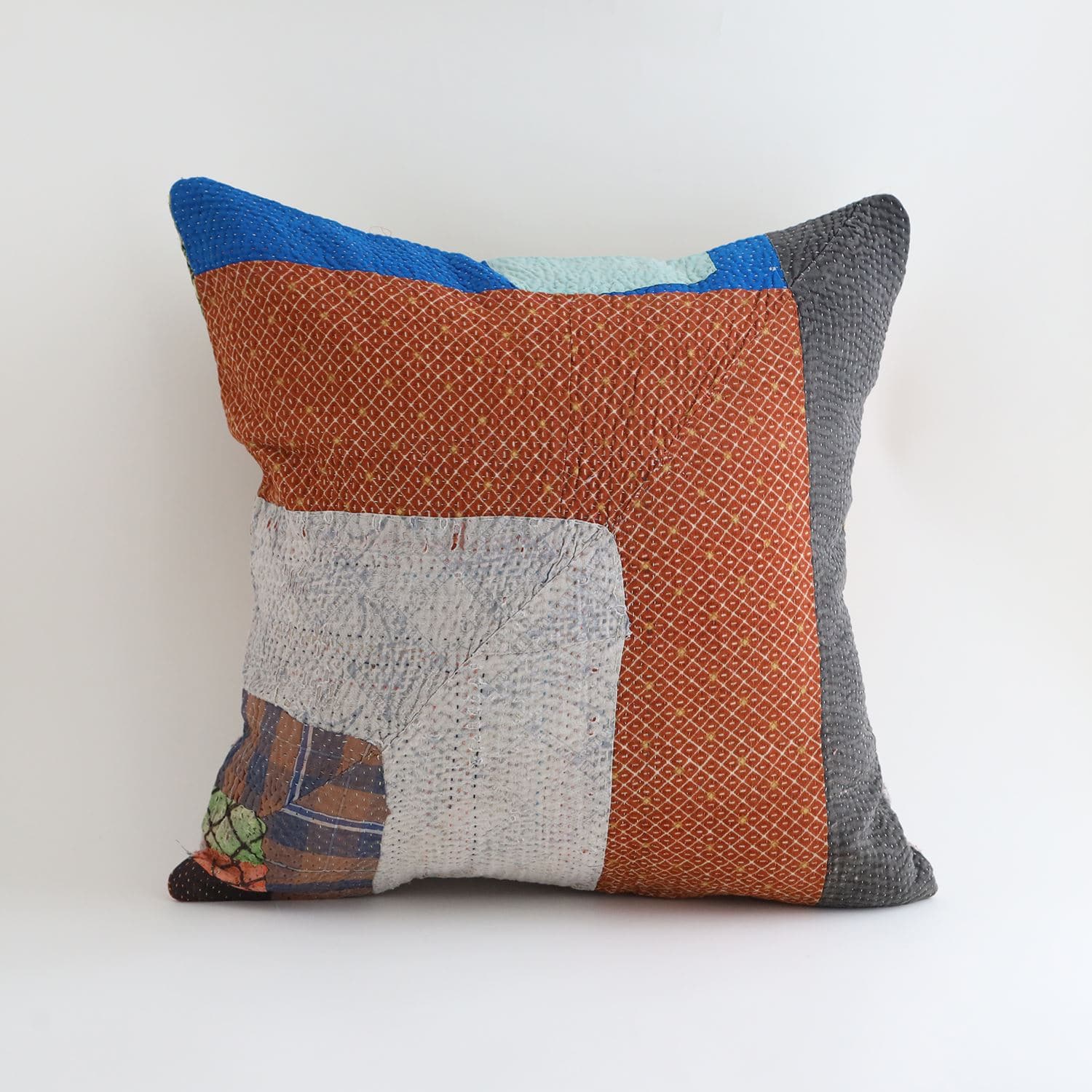 ラリーキルトを使ったクッションカバーです。ラリーキルトは、インド・パキスタンなどの中東アジアで、永い間受け継がれてきた伝統的な布です。古くなったサリーやデュパタ、腰布・古いハギレ等を貼り合わせてパッチワークし、丁寧に刺し子で合わせたもの。インダス河流域の遊牧民の家々では、嫁入り道具として母親から娘へ受け継がれています。気の遠くなるような作業を経て、わが子へ想いをこめて手渡します。一枚一枚に物語があって、何千年にも渡り母から娘へと伝えられる品。布の貼り合わせ方、刺し子の細やかさ、生地の厚みや柄など1つとして同じものはありません。丁寧にハンドメイドで作られているからこその味わいと魅力があります。