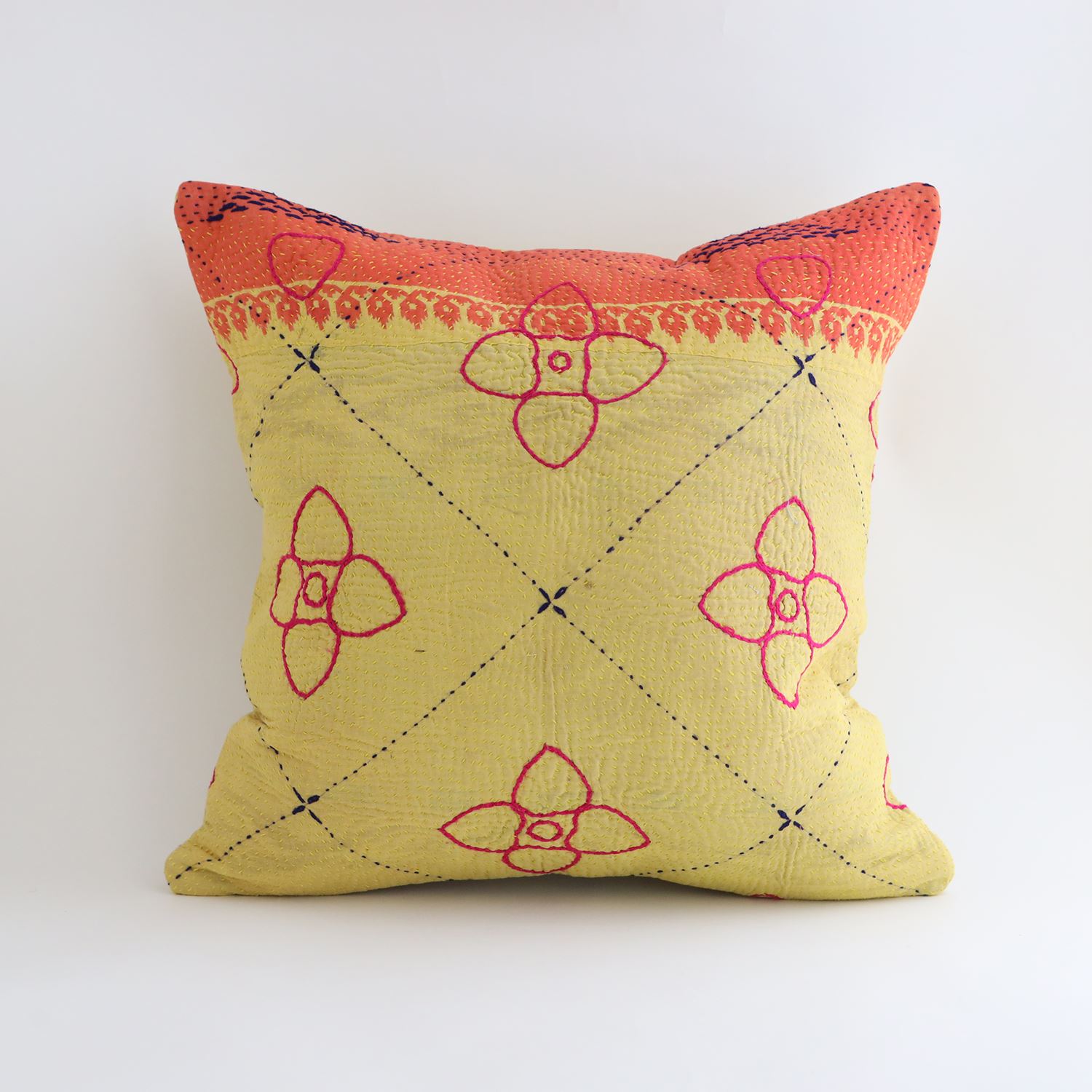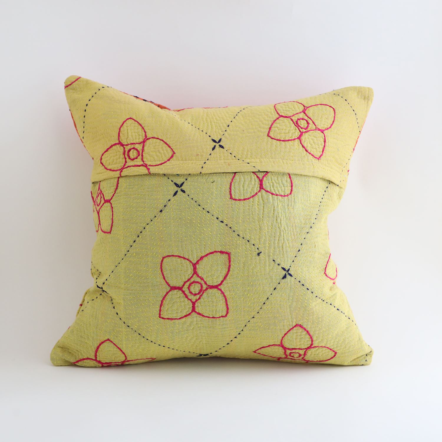 ラリーキルトを使ったクッションカバーです。ラリーキルトは、インド・パキスタンなどの中東アジアで、永い間受け継がれてきた伝統的な布です。古くなったサリーやデュパタ、腰布・古いハギレ等を貼り合わせてパッチワークし、丁寧に刺し子で合わせたもの。インダス河流域の遊牧民の家々では、嫁入り道具として母親から娘へ受け継がれています。気の遠くなるような作業を経て、わが子へ想いをこめて手渡します。一枚一枚に物語があって、何千年にも渡り母から娘へと伝えられる品。布の貼り合わせ方、刺し子の細やかさ、生地の厚みや柄など1つとして同じものはありません。丁寧にハンドメイドで作られているからこその味わいと魅力があります。