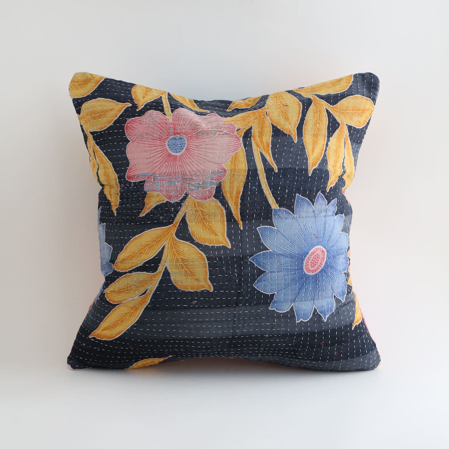 ラリーキルトを使ったクッションカバーです。ラリーキルトは、インド・パキスタンなどの中東アジアで、永い間受け継がれてきた伝統的な布です。古くなったサリーやデュパタ、腰布・古いハギレ等を貼り合わせてパッチワークし、丁寧に刺し子で合わせたもの。インダス河流域の遊牧民の家々では、嫁入り道具として母親から娘へ受け継がれています。気の遠くなるような作業を経て、わが子へ想いをこめて手渡します。一枚一枚に物語があって、何千年にも渡り母から娘へと伝えられる品。布の貼り合わせ方、刺し子の細やかさ、生地の厚みや柄など1つとして同じものはありません。丁寧にハンドメイドで作られているからこその味わいと魅力があります。