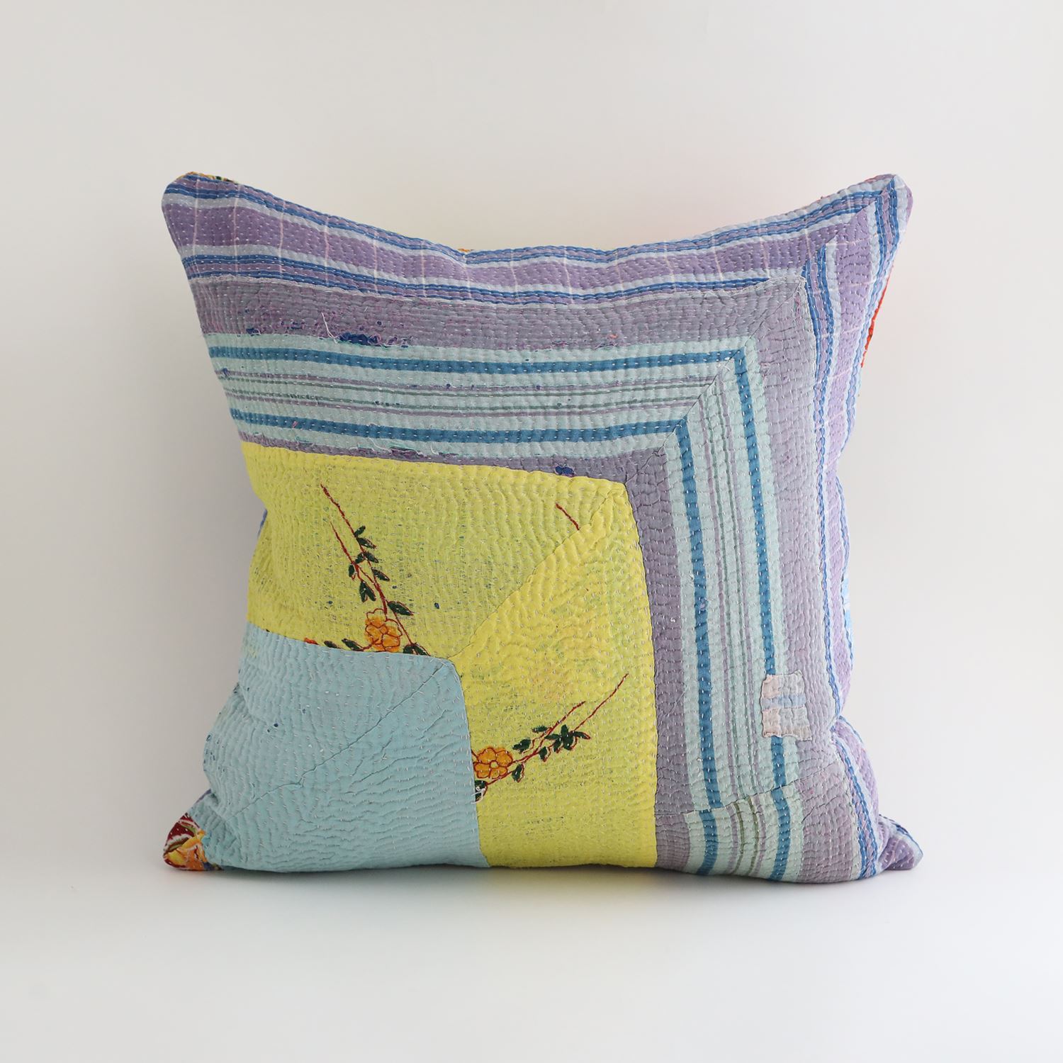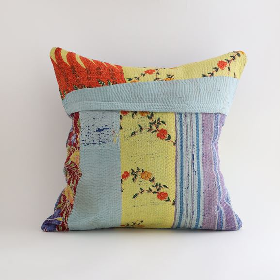 ラリーキルトを使ったクッションカバーです。ラリーキルトは、インド・パキスタンなどの中東アジアで、永い間受け継がれてきた伝統的な布です。古くなったサリーやデュパタ、腰布・古いハギレ等を貼り合わせてパッチワークし、丁寧に刺し子で合わせたもの。インダス河流域の遊牧民の家々では、嫁入り道具として母親から娘へ受け継がれています。気の遠くなるような作業を経て、わが子へ想いをこめて手渡します。一枚一枚に物語があって、何千年にも渡り母から娘へと伝えられる品。布の貼り合わせ方、刺し子の細やかさ、生地の厚みや柄など1つとして同じものはありません。丁寧にハンドメイドで作られているからこその味わいと魅力があります。
