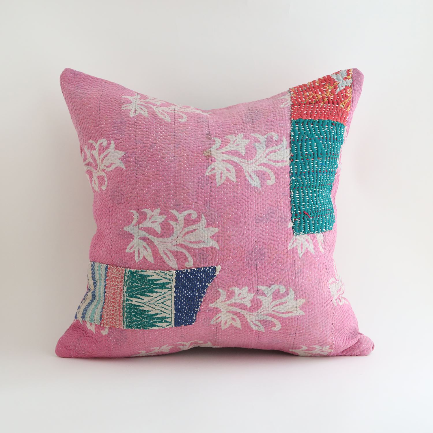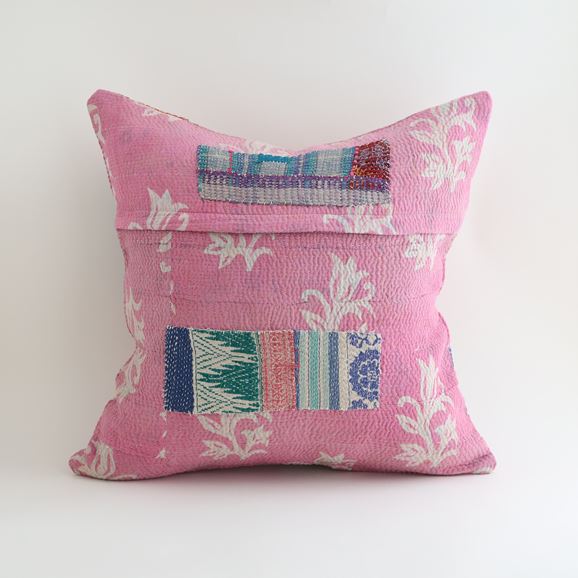 ラリーキルトを使ったクッションカバーです。ラリーキルトは、インド・パキスタンなどの中東アジアで、永い間受け継がれてきた伝統的な布です。古くなったサリーやデュパタ、腰布・古いハギレ等を貼り合わせてパッチワークし、丁寧に刺し子で合わせたもの。インダス河流域の遊牧民の家々では、嫁入り道具として母親から娘へ受け継がれています。気の遠くなるような作業を経て、わが子へ想いをこめて手渡します。一枚一枚に物語があって、何千年にも渡り母から娘へと伝えられる品。布の貼り合わせ方、刺し子の細やかさ、生地の厚みや柄など1つとして同じものはありません。丁寧にハンドメイドで作られているからこその味わいと魅力があります。
