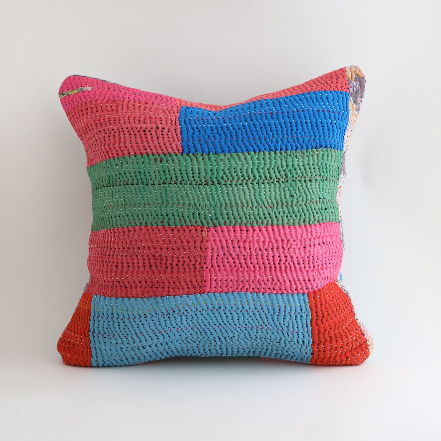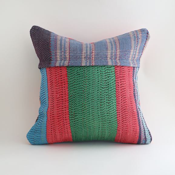 ラリーキルトを使ったクッションカバーです。ラリーキルトは、インド・パキスタンなどの中東アジアで、永い間受け継がれてきた伝統的な布です。古くなったサリーやデュパタ、腰布・古いハギレ等を貼り合わせてパッチワークし、丁寧に刺し子で合わせたもの。インダス河流域の遊牧民の家々では、嫁入り道具として母親から娘へ受け継がれています。気の遠くなるような作業を経て、わが子へ想いをこめて手渡します。一枚一枚に物語があって、何千年にも渡り母から娘へと伝えられる品。布の貼り合わせ方、刺し子の細やかさ、生地の厚みや柄など1つとして同じものはありません。丁寧にハンドメイドで作られているからこその味わいと魅力があります。