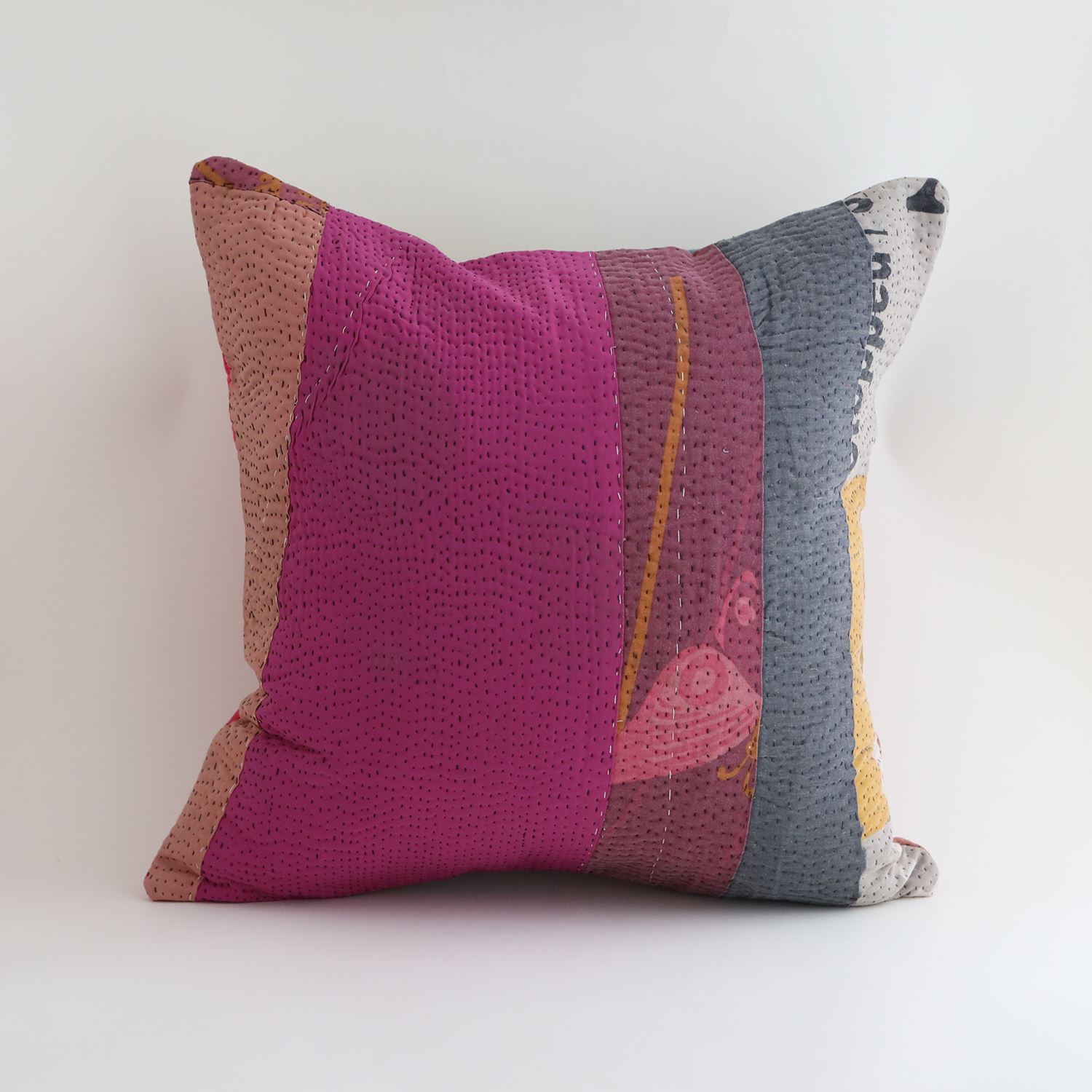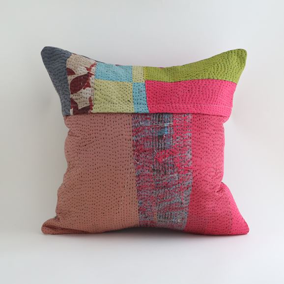 ラリーキルトを使ったクッションカバーです。ラリーキルトは、インド・パキスタンなどの中東アジアで、永い間受け継がれてきた伝統的な布です。古くなったサリーやデュパタ、腰布・古いハギレ等を貼り合わせてパッチワークし、丁寧に刺し子で合わせたもの。インダス河流域の遊牧民の家々では、嫁入り道具として母親から娘へ受け継がれています。気の遠くなるような作業を経て、わが子へ想いをこめて手渡します。一枚一枚に物語があって、何千年にも渡り母から娘へと伝えられる品。布の貼り合わせ方、刺し子の細やかさ、生地の厚みや柄など1つとして同じものはありません。丁寧にハンドメイドで作られているからこその味わいと魅力があります。