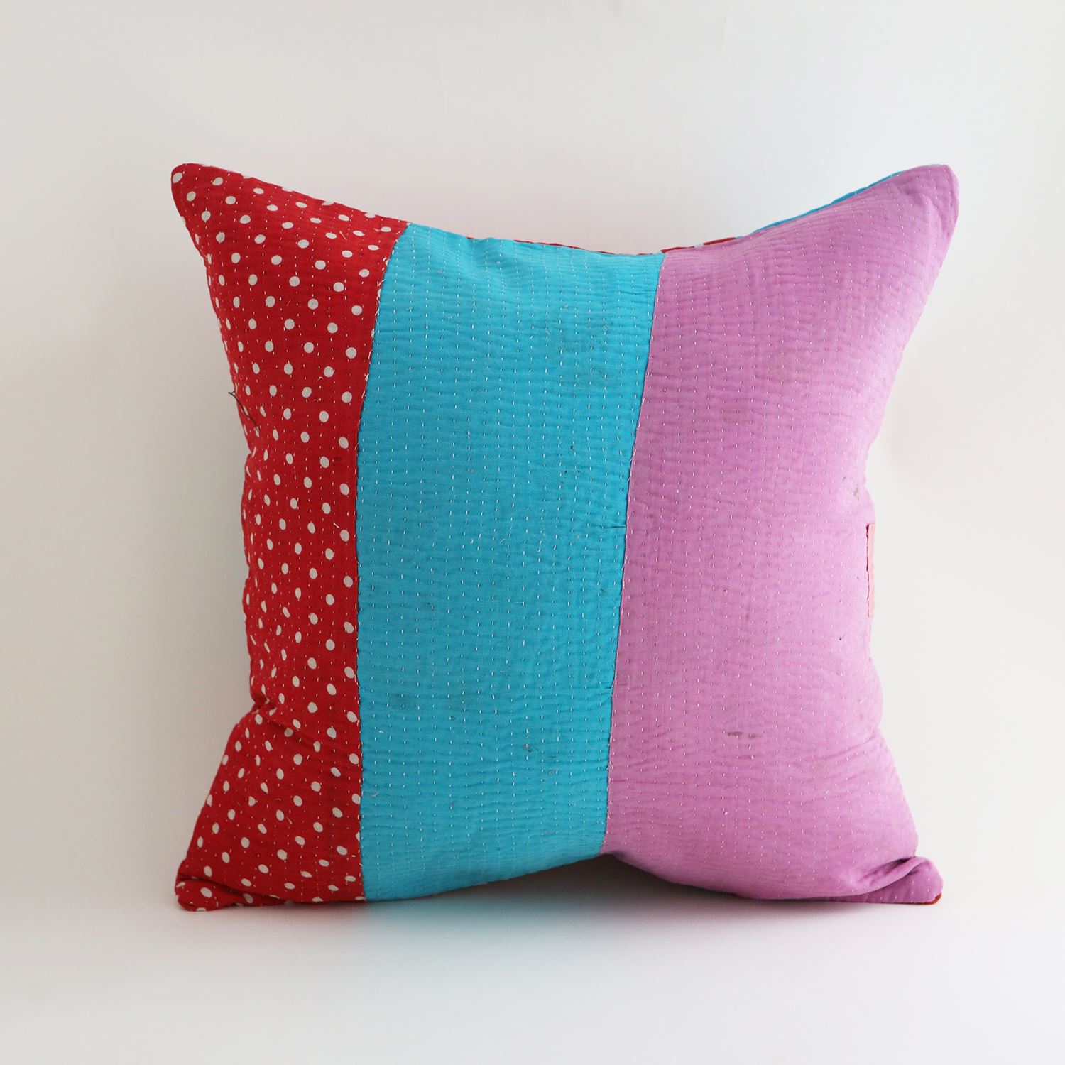 ラリーキルトを使ったクッションカバーです。ラリーキルトは、インド・パキスタンなどの中東アジアで、永い間受け継がれてきた伝統的な布です。古くなったサリーやデュパタ、腰布・古いハギレ等を貼り合わせてパッチワークし、丁寧に刺し子で合わせたもの。インダス河流域の遊牧民の家々では、嫁入り道具として母親から娘へ受け継がれています。気の遠くなるような作業を経て、わが子へ想いをこめて手渡します。一枚一枚に物語があって、何千年にも渡り母から娘へと伝えられる品。布の貼り合わせ方、刺し子の細やかさ、生地の厚みや柄など1つとして同じものはありません。丁寧にハンドメイドで作られているからこその味わいと魅力があります。