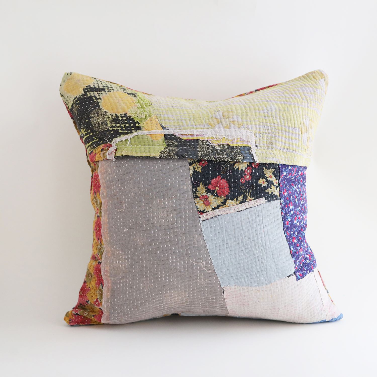 ラリーキルトを使ったクッションカバーです。ラリーキルトは、インド・パキスタンなどの中東アジアで、永い間受け継がれてきた伝統的な布です。古くなったサリーやデュパタ、腰布・古いハギレ等を貼り合わせてパッチワークし、丁寧に刺し子で合わせたもの。インダス河流域の遊牧民の家々では、嫁入り道具として母親から娘へ受け継がれています。気の遠くなるような作業を経て、わが子へ想いをこめて手渡します。一枚一枚に物語があって、何千年にも渡り母から娘へと伝えられる品。布の貼り合わせ方、刺し子の細やかさ、生地の厚みや柄など1つとして同じものはありません。丁寧にハンドメイドで作られているからこその味わいと魅力があります。