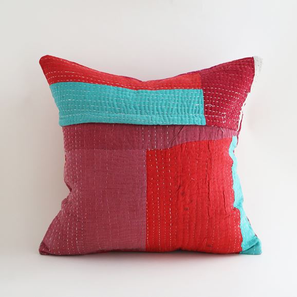 ラリーキルトを使ったクッションカバーです。ラリーキルトは、インド・パキスタンなどの中東アジアで、永い間受け継がれてきた伝統的な布です。古くなったサリーやデュパタ、腰布・古いハギレ等を貼り合わせてパッチワークし、丁寧に刺し子で合わせたもの。インダス河流域の遊牧民の家々では、嫁入り道具として母親から娘へ受け継がれています。気の遠くなるような作業を経て、わが子へ想いをこめて手渡します。一枚一枚に物語があって、何千年にも渡り母から娘へと伝えられる品。布の貼り合わせ方、刺し子の細やかさ、生地の厚みや柄など1つとして同じものはありません。丁寧にハンドメイドで作られているからこその味わいと魅力があります。
