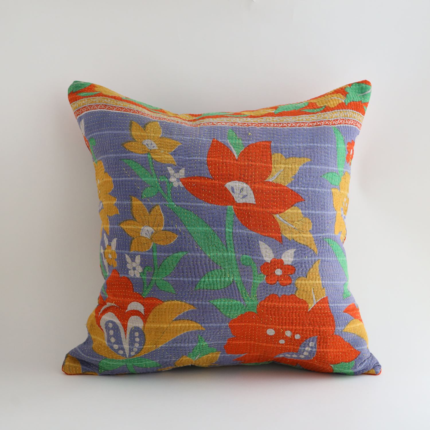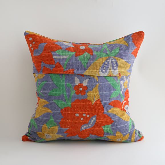 ラリーキルトを使ったクッションカバーです。ラリーキルトは、インド・パキスタンなどの中東アジアで、永い間受け継がれてきた伝統的な布です。古くなったサリーやデュパタ、腰布・古いハギレ等を貼り合わせてパッチワークし、丁寧に刺し子で合わせたもの。インダス河流域の遊牧民の家々では、嫁入り道具として母親から娘へ受け継がれています。気の遠くなるような作業を経て、わが子へ想いをこめて手渡します。一枚一枚に物語があって、何千年にも渡り母から娘へと伝えられる品。布の貼り合わせ方、刺し子の細やかさ、生地の厚みや柄など1つとして同じものはありません。丁寧にハンドメイドで作られているからこその味わいと魅力があります。
