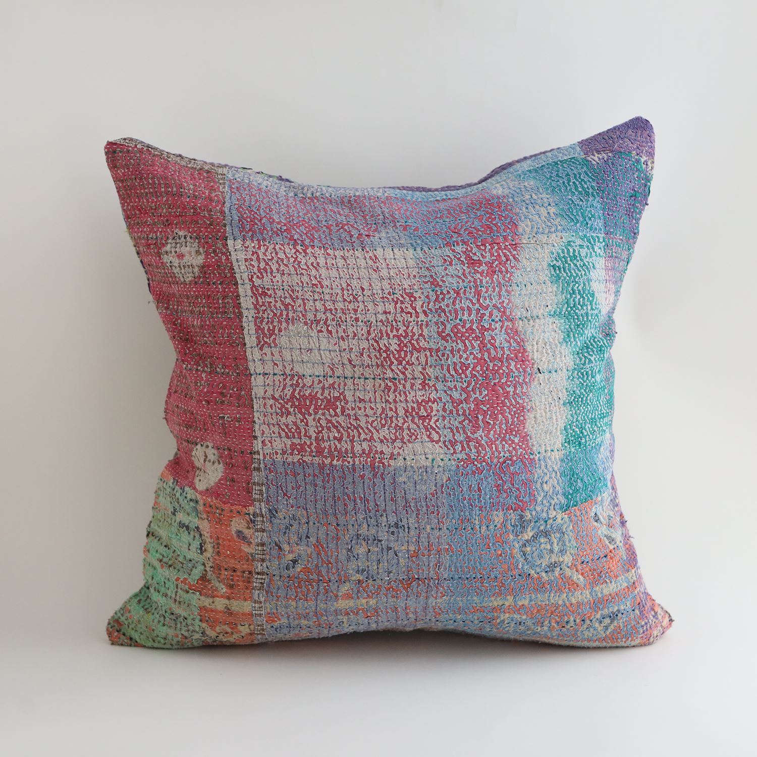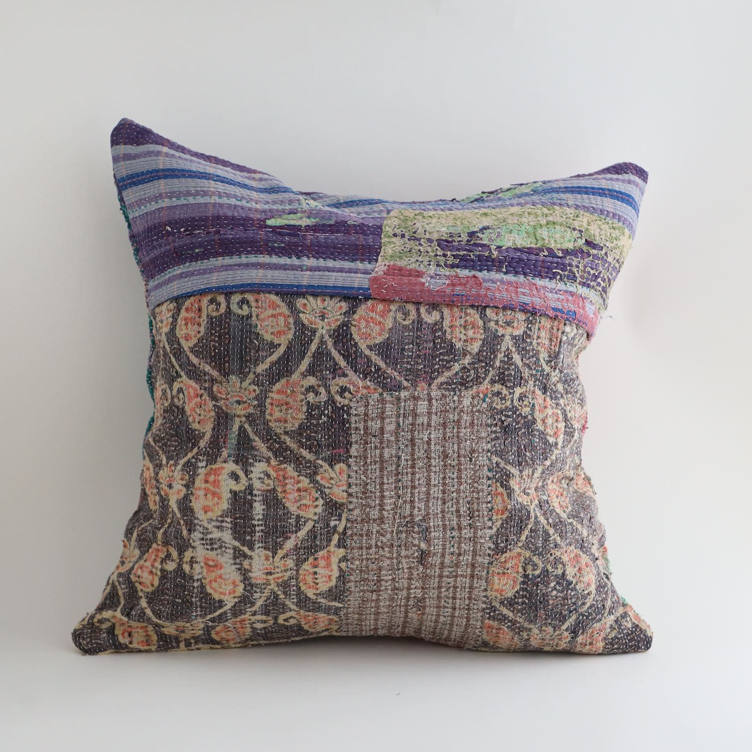 ラリーキルトを使ったクッションカバーです。ラリーキルトは、インド・パキスタンなどの中東アジアで、永い間受け継がれてきた伝統的な布です。古くなったサリーやデュパタ、腰布・古いハギレ等を貼り合わせてパッチワークし、丁寧に刺し子で合わせたもの。インダス河流域の遊牧民の家々では、嫁入り道具として母親から娘へ受け継がれています。気の遠くなるような作業を経て、わが子へ想いをこめて手渡します。一枚一枚に物語があって、何千年にも渡り母から娘へと伝えられる品。布の貼り合わせ方、刺し子の細やかさ、生地の厚みや柄など1つとして同じものはありません。丁寧にハンドメイドで作られているからこその味わいと魅力があります。