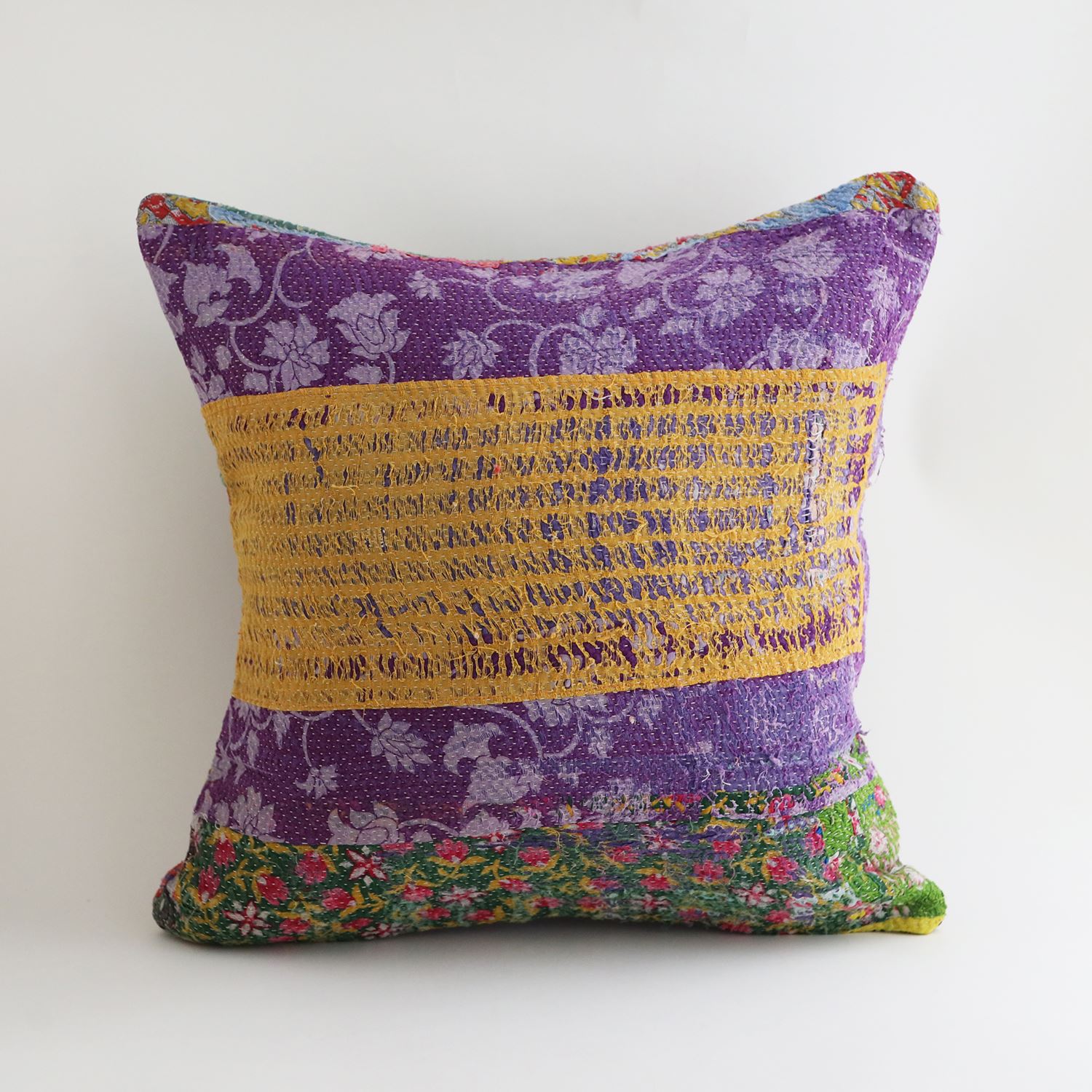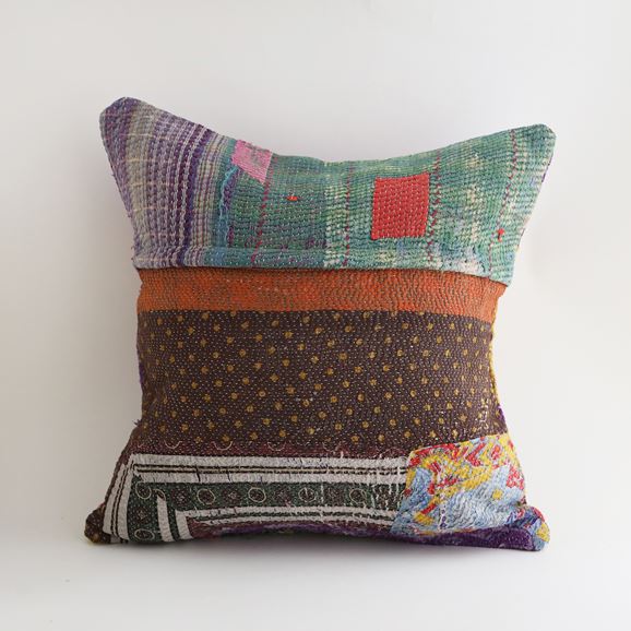 ラリーキルトを使ったクッションカバーです。ラリーキルトは、インド・パキスタンなどの中東アジアで、永い間受け継がれてきた伝統的な布です。古くなったサリーやデュパタ、腰布・古いハギレ等を貼り合わせてパッチワークし、丁寧に刺し子で合わせたもの。インダス河流域の遊牧民の家々では、嫁入り道具として母親から娘へ受け継がれています。気の遠くなるような作業を経て、わが子へ想いをこめて手渡します。一枚一枚に物語があって、何千年にも渡り母から娘へと伝えられる品。布の貼り合わせ方、刺し子の細やかさ、生地の厚みや柄など1つとして同じものはありません。丁寧にハンドメイドで作られているからこその味わいと魅力があります。