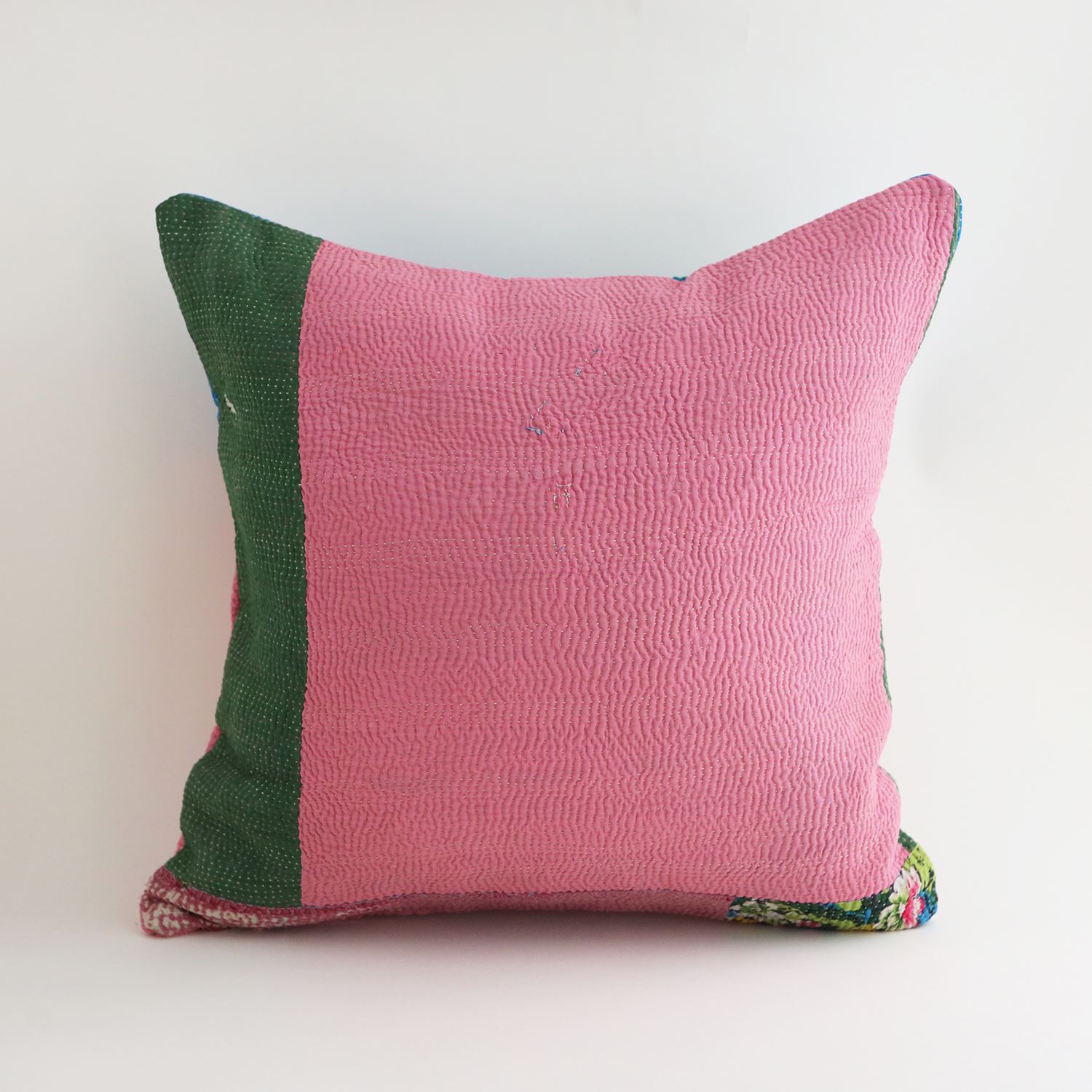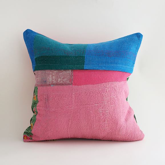 ラリーキルトを使ったクッションカバーです。ラリーキルトは、インド・パキスタンなどの中東アジアで、永い間受け継がれてきた伝統的な布です。古くなったサリーやデュパタ、腰布・古いハギレ等を貼り合わせてパッチワークし、丁寧に刺し子で合わせたもの。インダス河流域の遊牧民の家々では、嫁入り道具として母親から娘へ受け継がれています。気の遠くなるような作業を経て、わが子へ想いをこめて手渡します。一枚一枚に物語があって、何千年にも渡り母から娘へと伝えられる品。布の貼り合わせ方、刺し子の細やかさ、生地の厚みや柄など1つとして同じものはありません。丁寧にハンドメイドで作られているからこその味わいと魅力があります。