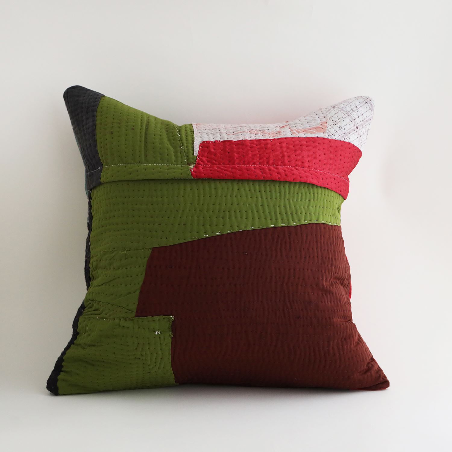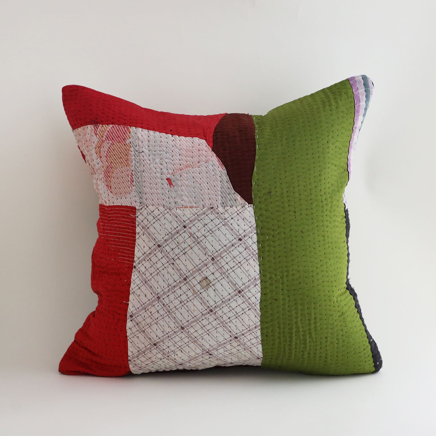 ラリーキルトを使ったクッションカバーです。ラリーキルトは、インド・パキスタンなどの中東アジアで、永い間受け継がれてきた伝統的な布です。古くなったサリーやデュパタ、腰布・古いハギレ等を貼り合わせてパッチワークし、丁寧に刺し子で合わせたもの。インダス河流域の遊牧民の家々では、嫁入り道具として母親から娘へ受け継がれています。気の遠くなるような作業を経て、わが子へ想いをこめて手渡します。一枚一枚に物語があって、何千年にも渡り母から娘へと伝えられる品。布の貼り合わせ方、刺し子の細やかさ、生地の厚みや柄など1つとして同じものはありません。丁寧にハンドメイドで作られているからこその味わいと魅力があります。