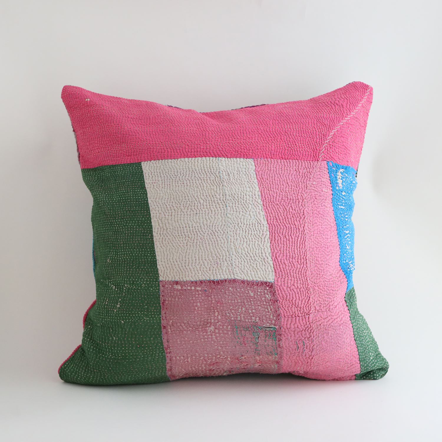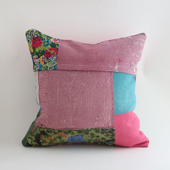 ラリーキルトを使ったクッションカバーです。ラリーキルトは、インド・パキスタンなどの中東アジアで、永い間受け継がれてきた伝統的な布です。古くなったサリーやデュパタ、腰布・古いハギレ等を貼り合わせてパッチワークし、丁寧に刺し子で合わせたもの。インダス河流域の遊牧民の家々では、嫁入り道具として母親から娘へ受け継がれています。気の遠くなるような作業を経て、わが子へ想いをこめて手渡します。一枚一枚に物語があって、何千年にも渡り母から娘へと伝えられる品。布の貼り合わせ方、刺し子の細やかさ、生地の厚みや柄など1つとして同じものはありません。丁寧にハンドメイドで作られているからこその味わいと魅力があります。