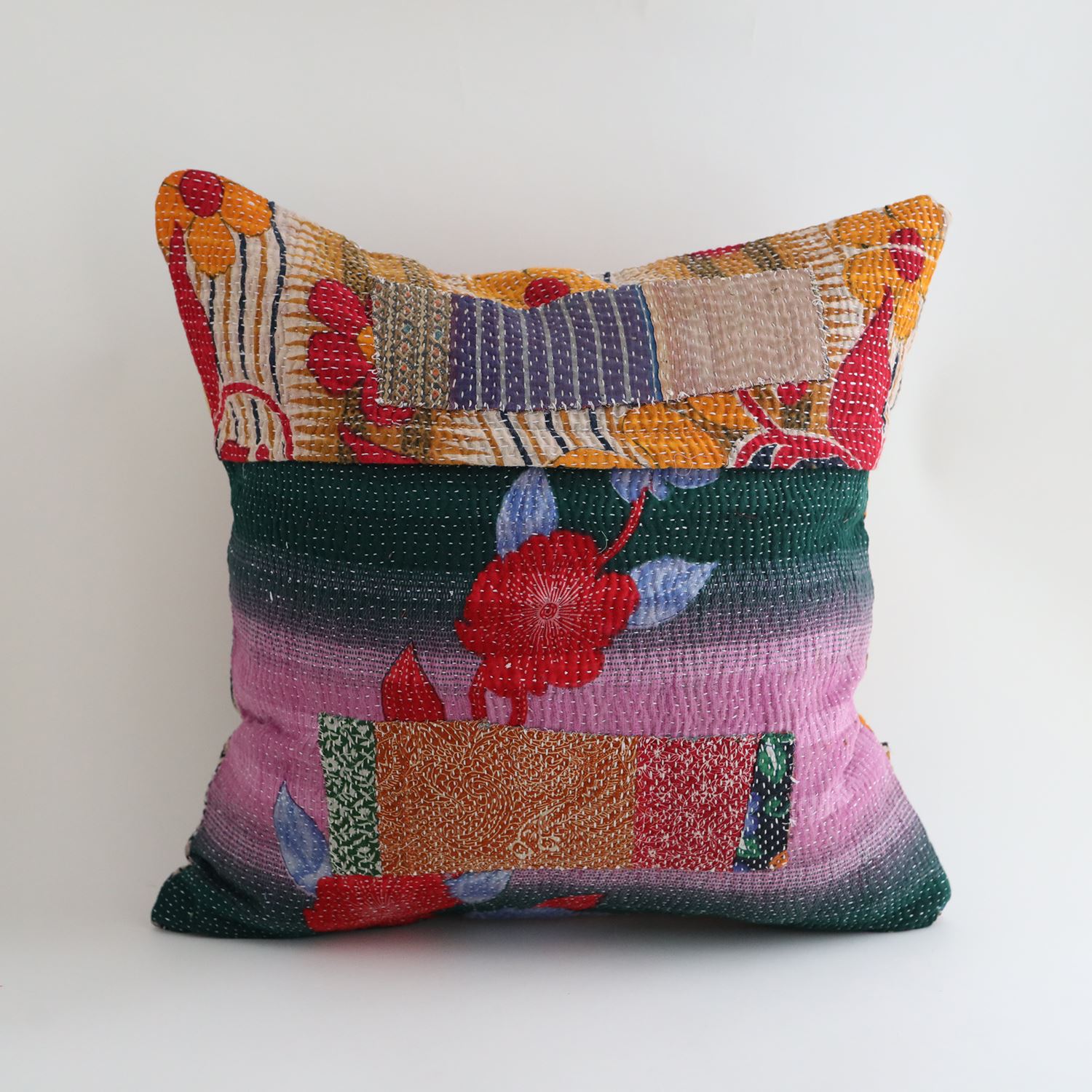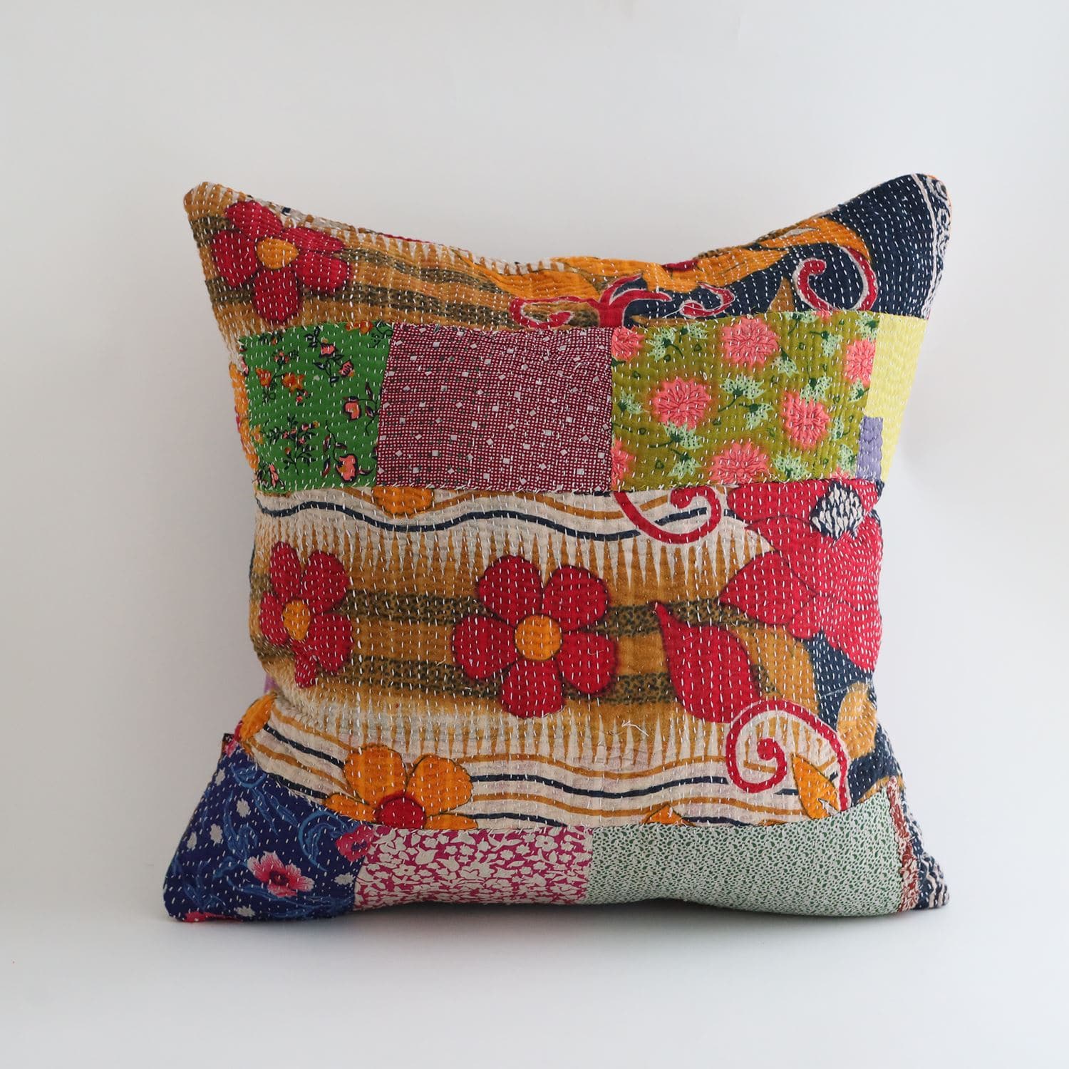 ラリーキルトを使ったクッションカバーです。ラリーキルトは、インド・パキスタンなどの中東アジアで、永い間受け継がれてきた伝統的な布です。古くなったサリーやデュパタ、腰布・古いハギレ等を貼り合わせてパッチワークし、丁寧に刺し子で合わせたもの。インダス河流域の遊牧民の家々では、嫁入り道具として母親から娘へ受け継がれています。気の遠くなるような作業を経て、わが子へ想いをこめて手渡します。一枚一枚に物語があって、何千年にも渡り母から娘へと伝えられる品。布の貼り合わせ方、刺し子の細やかさ、生地の厚みや柄など1つとして同じものはありません。丁寧にハンドメイドで作られているからこその味わいと魅力があります。