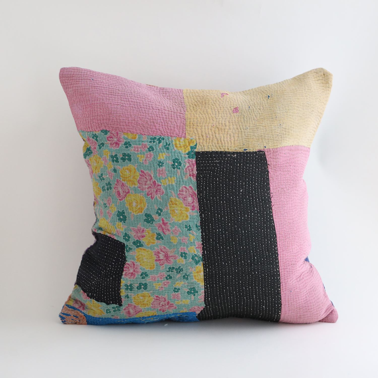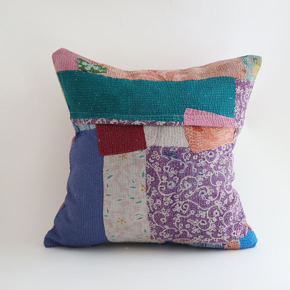 ラリーキルトを使ったクッションカバーです。ラリーキルトは、インド・パキスタンなどの中東アジアで、永い間受け継がれてきた伝統的な布です。古くなったサリーやデュパタ、腰布・古いハギレ等を貼り合わせてパッチワークし、丁寧に刺し子で合わせたもの。インダス河流域の遊牧民の家々では、嫁入り道具として母親から娘へ受け継がれています。気の遠くなるような作業を経て、わが子へ想いをこめて手渡します。一枚一枚に物語があって、何千年にも渡り母から娘へと伝えられる品。布の貼り合わせ方、刺し子の細やかさ、生地の厚みや柄など1つとして同じものはありません。丁寧にハンドメイドで作られているからこその味わいと魅力があります。