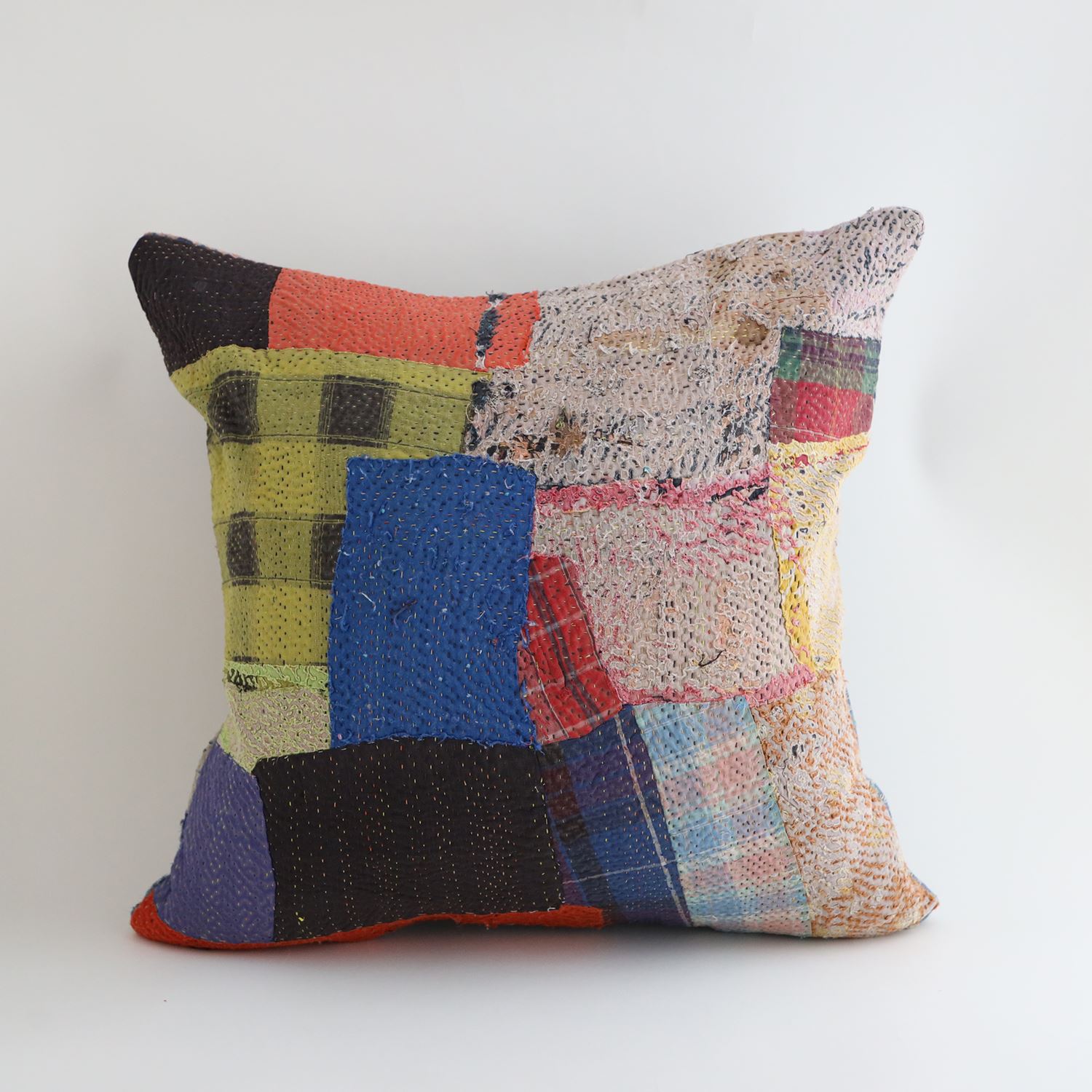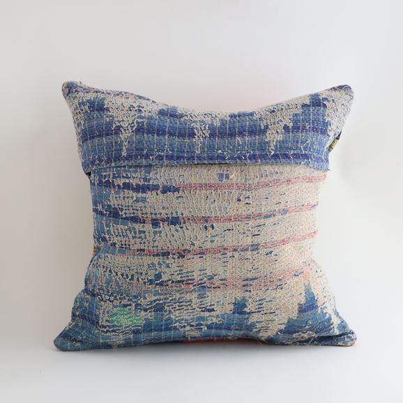 ラリーキルトを使ったクッションカバーです。ラリーキルトは、インド・パキスタンなどの中東アジアで、永い間受け継がれてきた伝統的な布です。古くなったサリーやデュパタ、腰布・古いハギレ等を貼り合わせてパッチワークし、丁寧に刺し子で合わせたもの。インダス河流域の遊牧民の家々では、嫁入り道具として母親から娘へ受け継がれています。気の遠くなるような作業を経て、わが子へ想いをこめて手渡します。一枚一枚に物語があって、何千年にも渡り母から娘へと伝えられる品。布の貼り合わせ方、刺し子の細やかさ、生地の厚みや柄など1つとして同じものはありません。丁寧にハンドメイドで作られているからこその味わいと魅力があります。