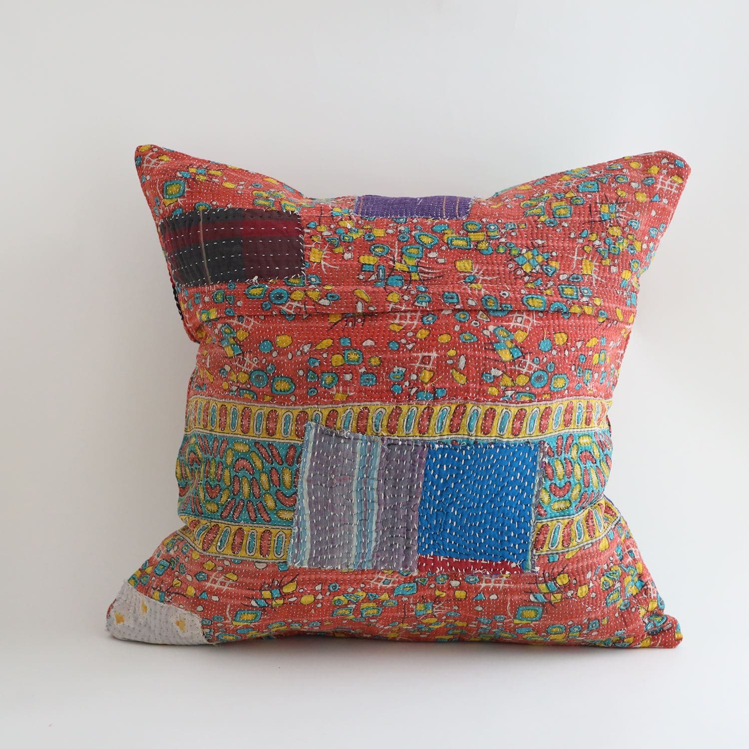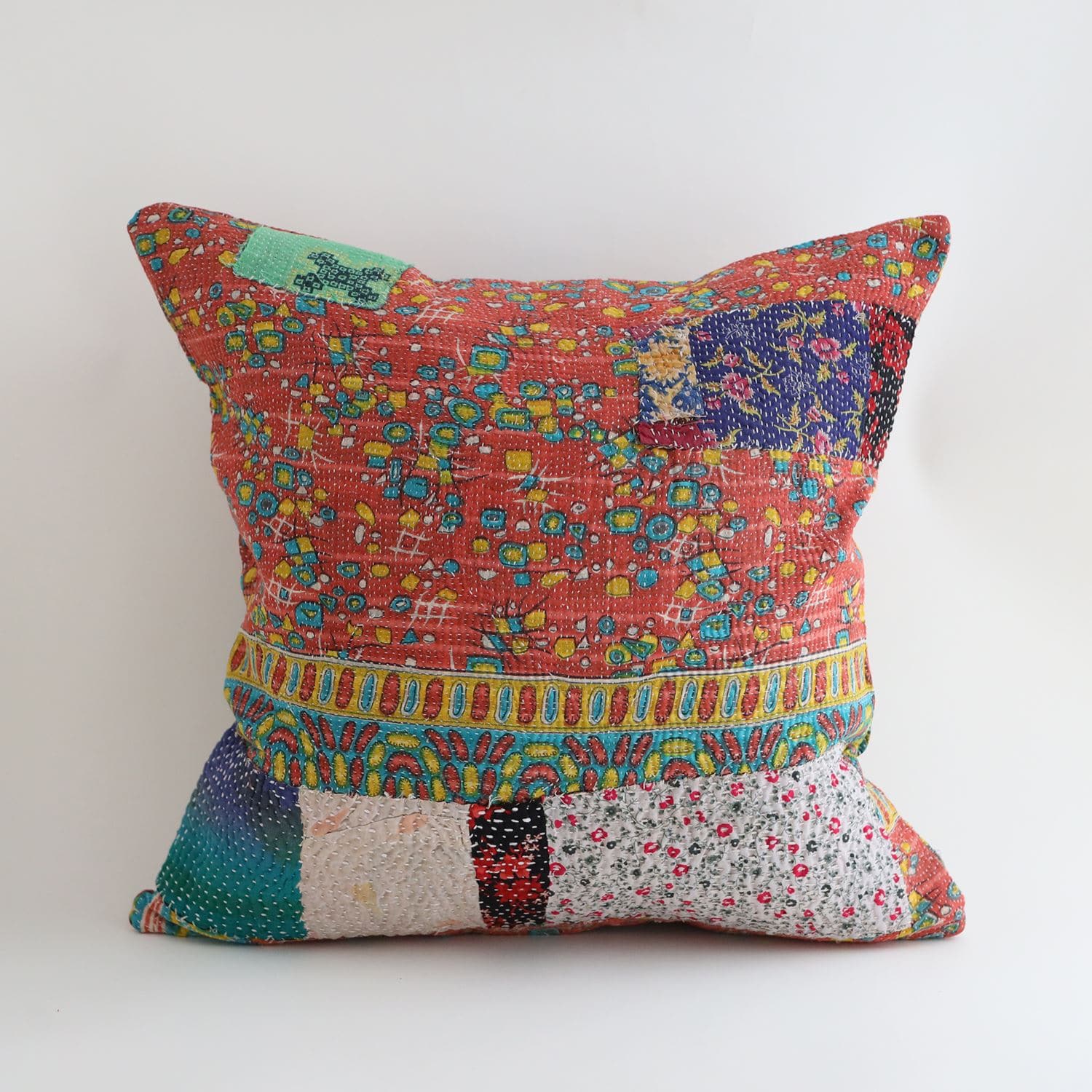 ラリーキルトを使ったクッションカバーです。ラリーキルトは、インド・パキスタンなどの中東アジアで、永い間受け継がれてきた伝統的な布です。古くなったサリーやデュパタ、腰布・古いハギレ等を貼り合わせてパッチワークし、丁寧に刺し子で合わせたもの。インダス河流域の遊牧民の家々では、嫁入り道具として母親から娘へ受け継がれています。気の遠くなるような作業を経て、わが子へ想いをこめて手渡します。一枚一枚に物語があって、何千年にも渡り母から娘へと伝えられる品。布の貼り合わせ方、刺し子の細やかさ、生地の厚みや柄など1つとして同じものはありません。丁寧にハンドメイドで作られているからこその味わいと魅力があります。
