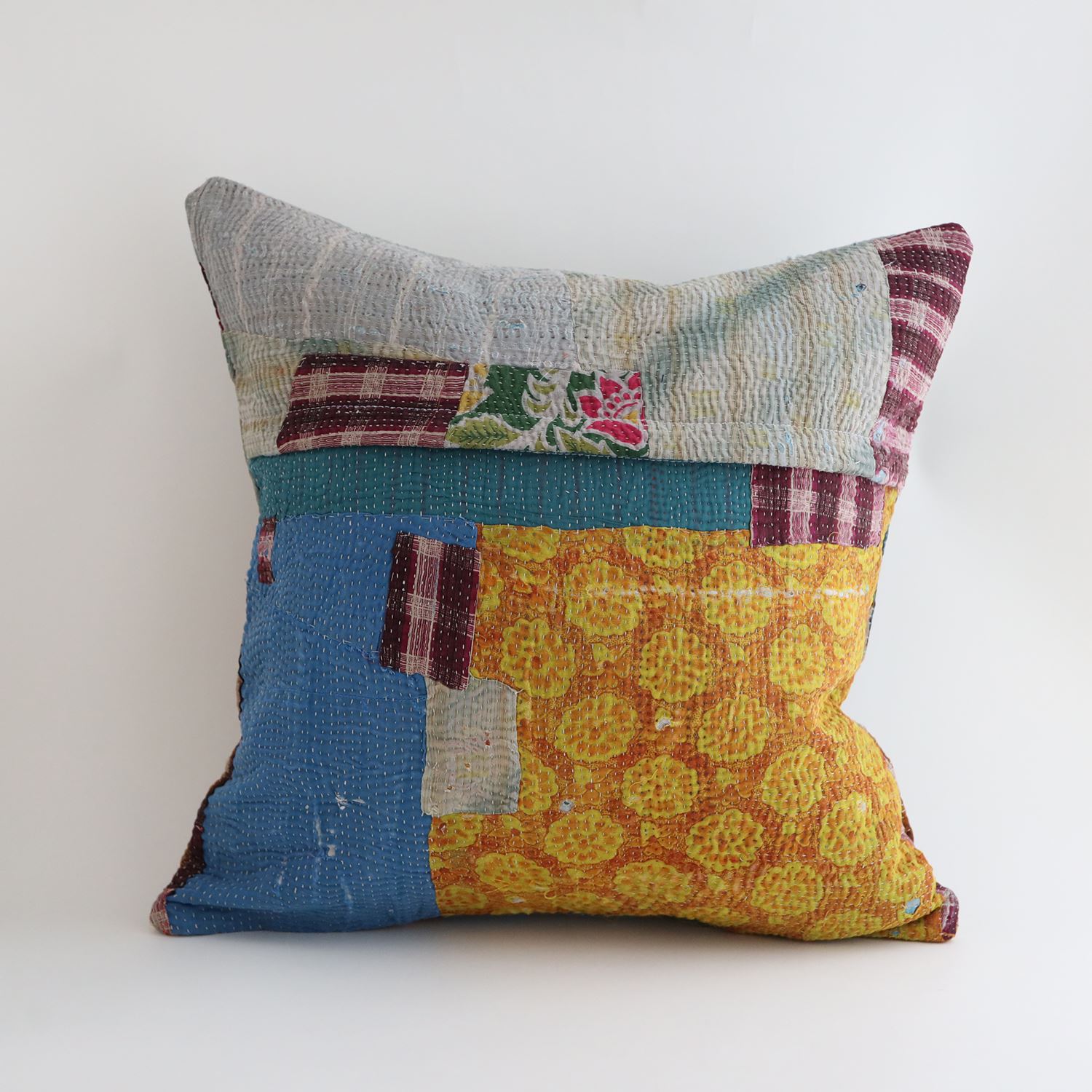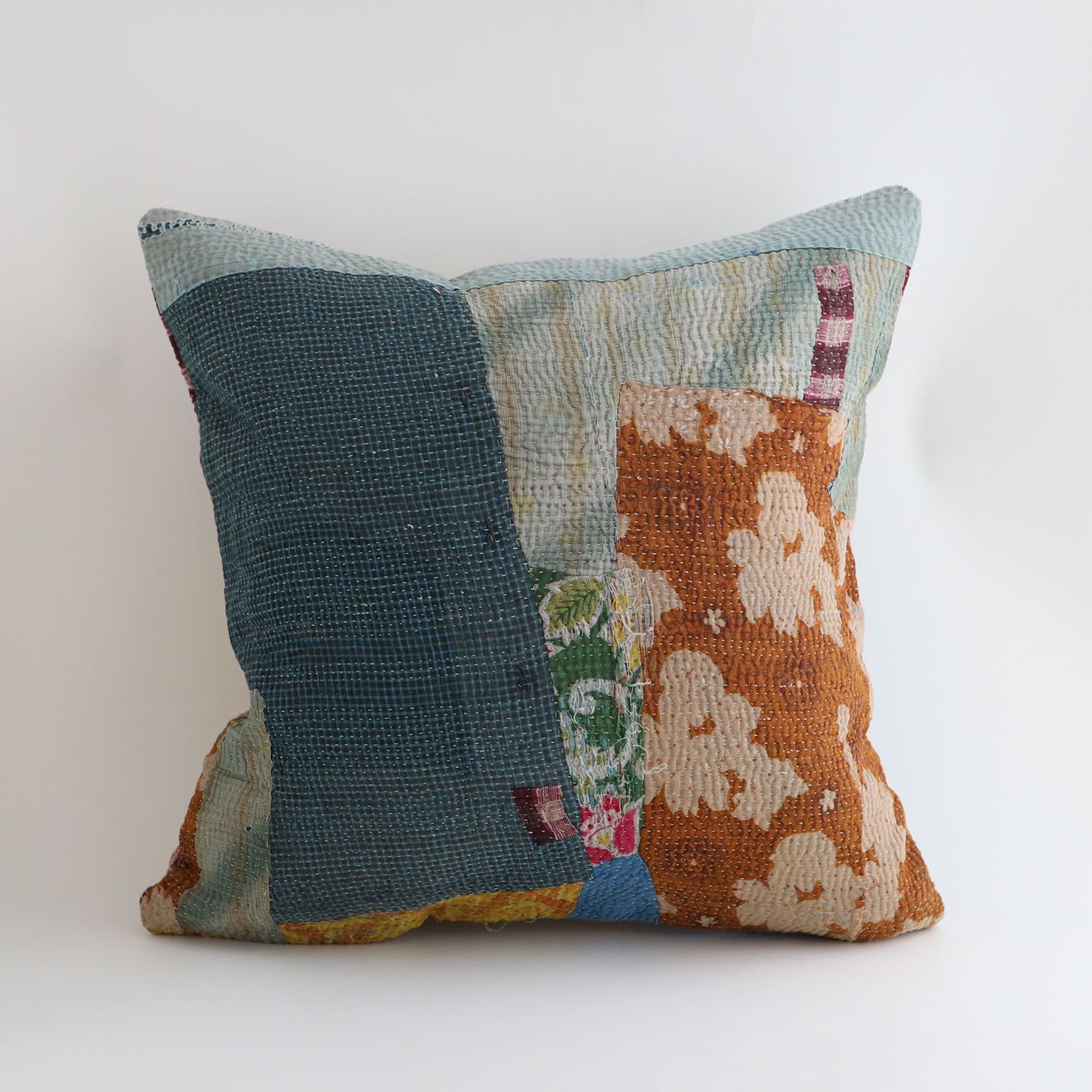 ラリーキルトを使ったクッションカバーです。ラリーキルトは、インド・パキスタンなどの中東アジアで、永い間受け継がれてきた伝統的な布です。古くなったサリーやデュパタ、腰布・古いハギレ等を貼り合わせてパッチワークし、丁寧に刺し子で合わせたもの。インダス河流域の遊牧民の家々では、嫁入り道具として母親から娘へ受け継がれています。気の遠くなるような作業を経て、わが子へ想いをこめて手渡します。一枚一枚に物語があって、何千年にも渡り母から娘へと伝えられる品。布の貼り合わせ方、刺し子の細やかさ、生地の厚みや柄など1つとして同じものはありません。丁寧にハンドメイドで作られているからこその味わいと魅力があります。