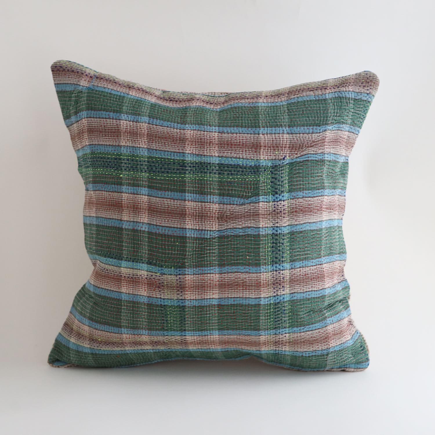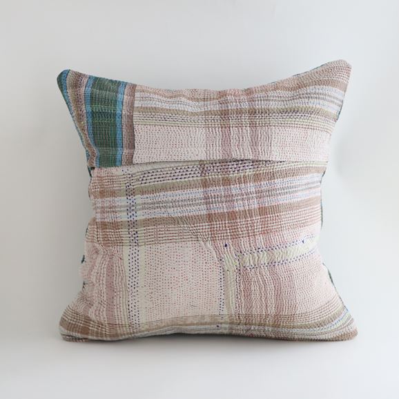 ラリーキルトを使ったクッションカバーです。ラリーキルトは、インド・パキスタンなどの中東アジアで、永い間受け継がれてきた伝統的な布です。古くなったサリーやデュパタ、腰布・古いハギレ等を貼り合わせてパッチワークし、丁寧に刺し子で合わせたもの。インダス河流域の遊牧民の家々では、嫁入り道具として母親から娘へ受け継がれています。気の遠くなるような作業を経て、わが子へ想いをこめて手渡します。一枚一枚に物語があって、何千年にも渡り母から娘へと伝えられる品。布の貼り合わせ方、刺し子の細やかさ、生地の厚みや柄など1つとして同じものはありません。丁寧にハンドメイドで作られているからこその味わいと魅力があります。